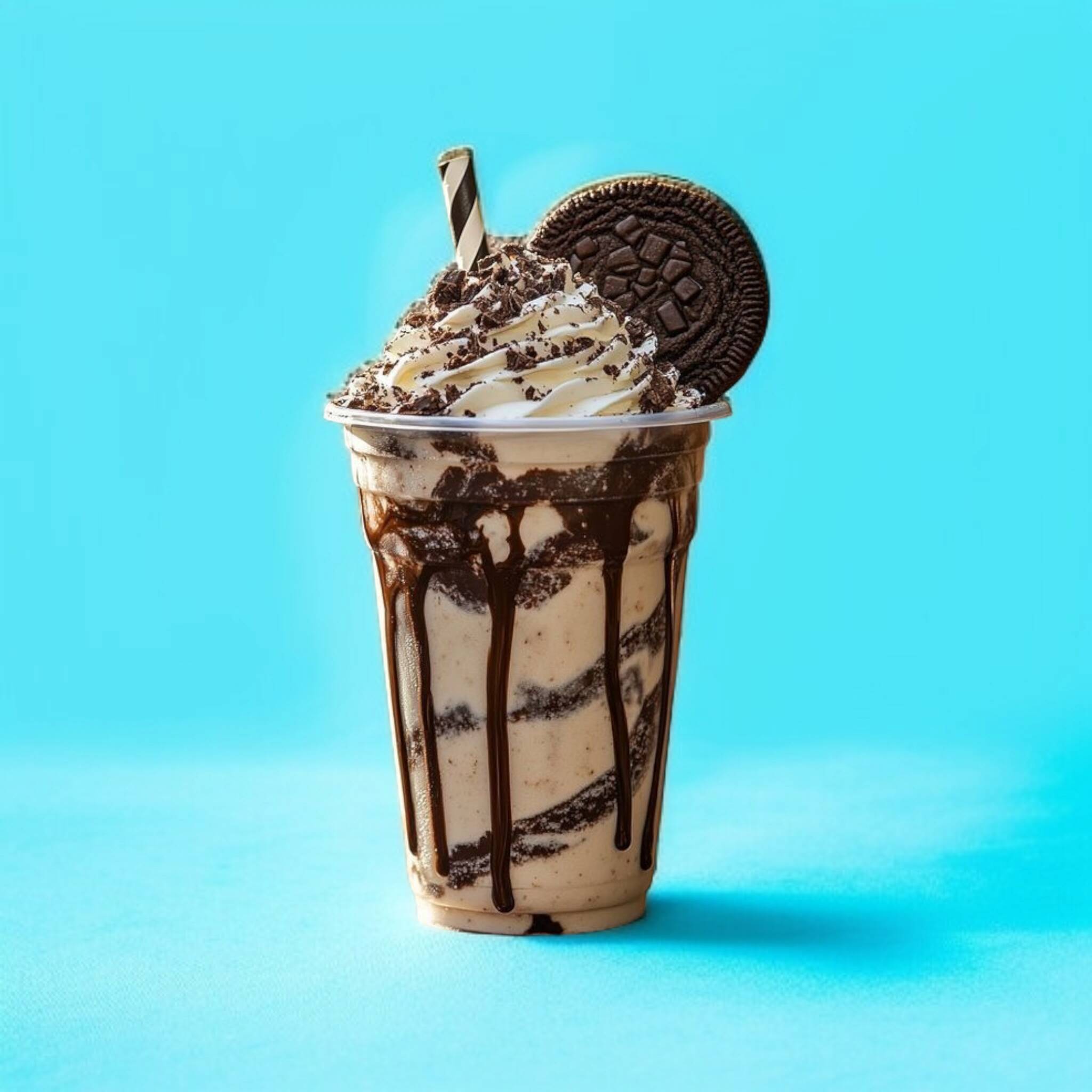 Frappé grande de 16oz, frappé de cookies and cream. Este exquisito batido combina la suavidad y cremosidad de la leche con la dulzura de las galletas Oreo trituradas, creando una mezcla perfecta que deleitará tus sentidos.