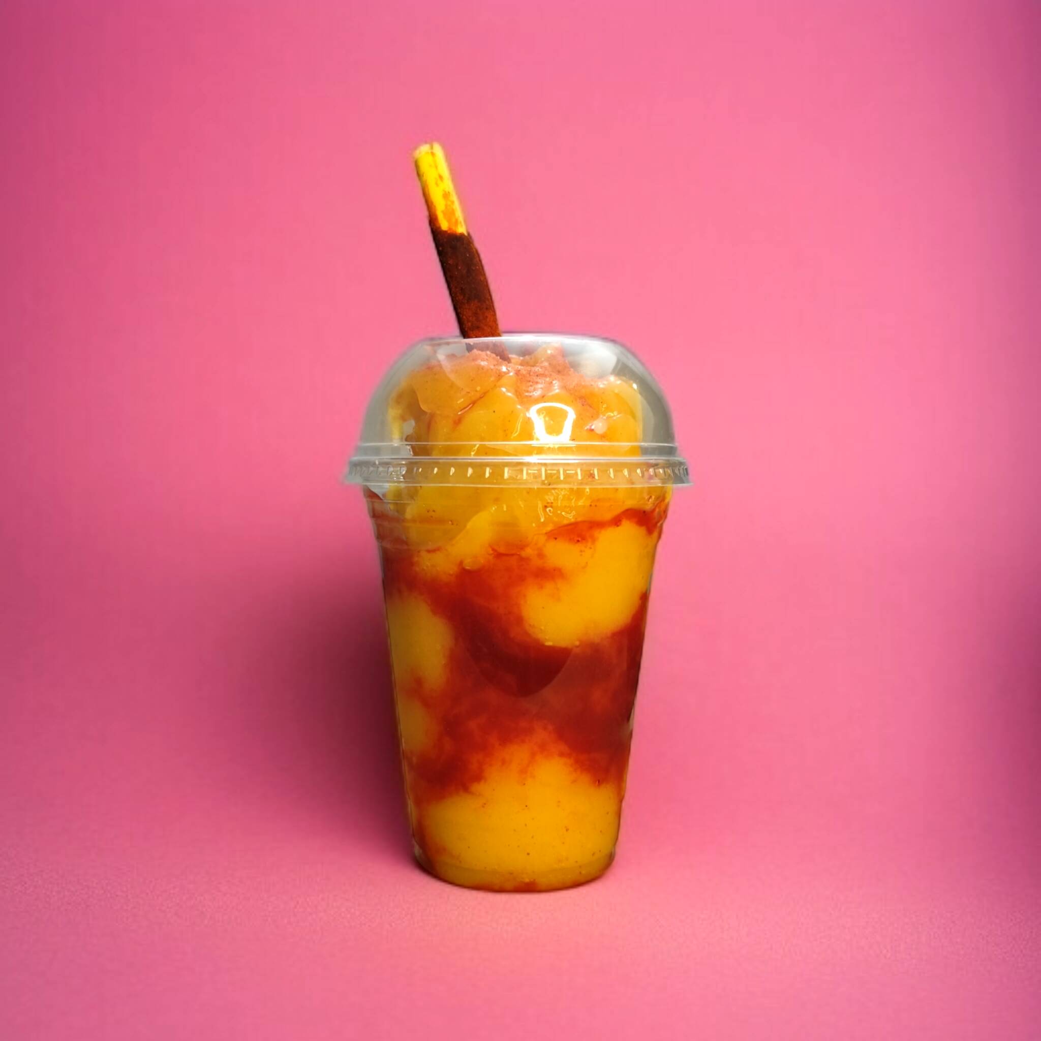 Rica chamoyada de Mango perfecta mezcla de hielo, mango, chamoy y miguelito acompañada de una banderilla de tamarindo.