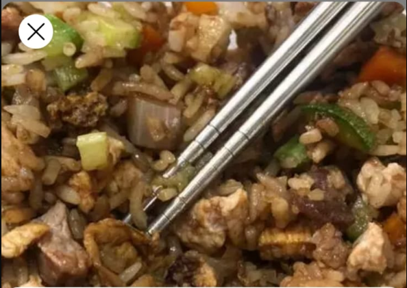 Arroz salteado a la parrilla acompañado de trozos de carne de cerdo, pollo y vegetales de temporada.