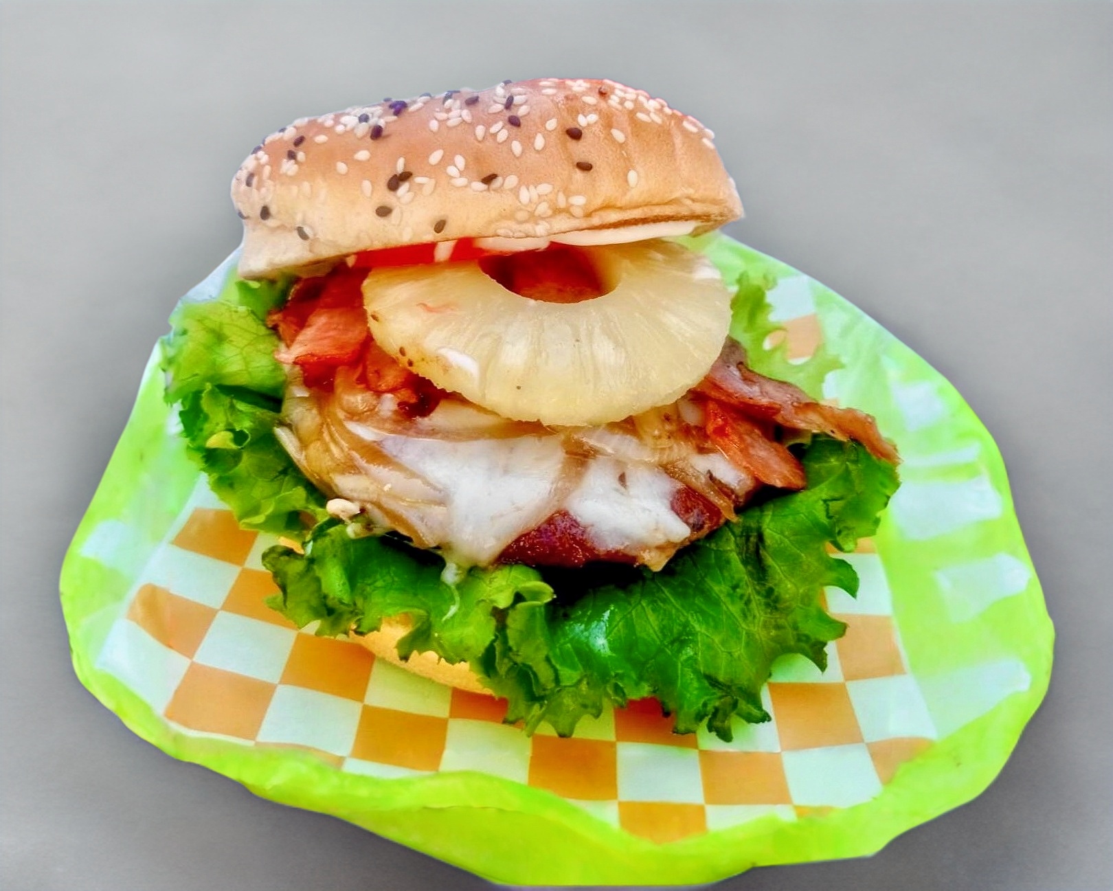 La combinación perfecta de dulce y salado: carne jugosa, jamon dorado, piña a la parrilla, queso amarillo derretido, lechuga italiana, jitomate y cebolla en pan suave. ¡Sabor tropical irresistible!