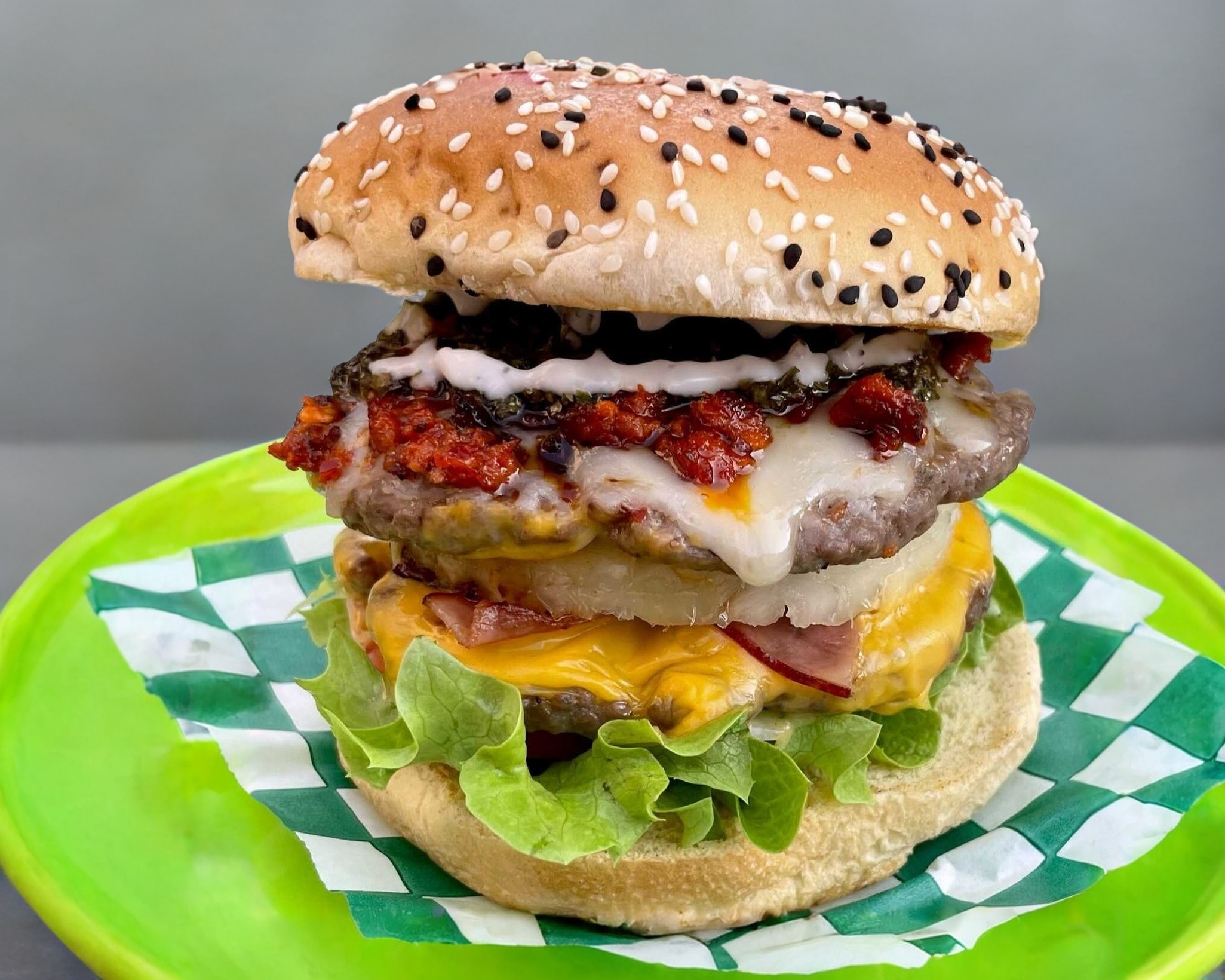 ¡Te presentamos la reina del menu: La Burger de Javivi´s! Doble carne, doble queso (Monterrey Jack y amarillo) piña asada, chorizo bien doradito, tocino crujiente, cebolla caramelizada y nuestro toque especial de chimichurri. Una bomba de sabor que mezcla lo dulce, lo salado, lo ahumado y lo jugoso en una sola mordida. Te atreves a probarla?