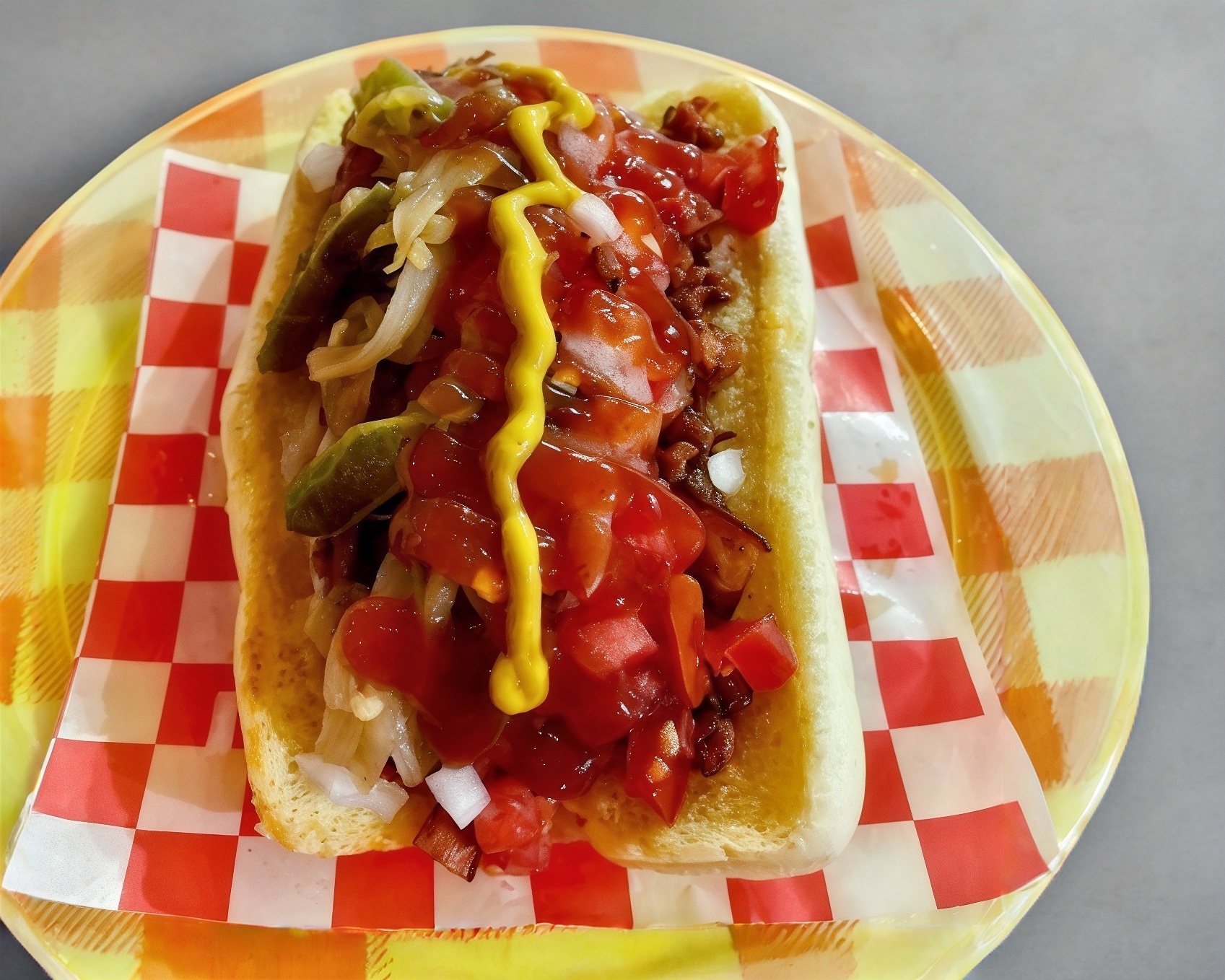 Salchicha frita acompañada con tocineta crujiente, jitomate y cebolla. Te encantara