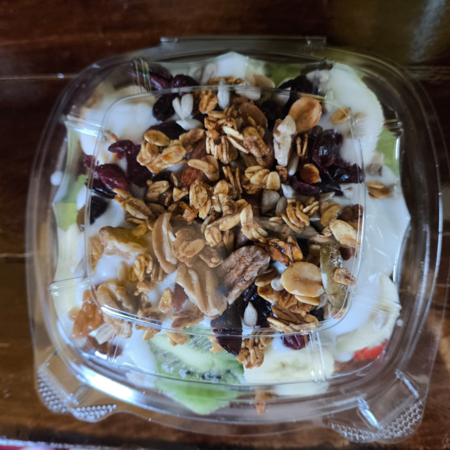 Fruta de temporada con miel, granola, arándano, ajonjolí garapiñado y nuez.