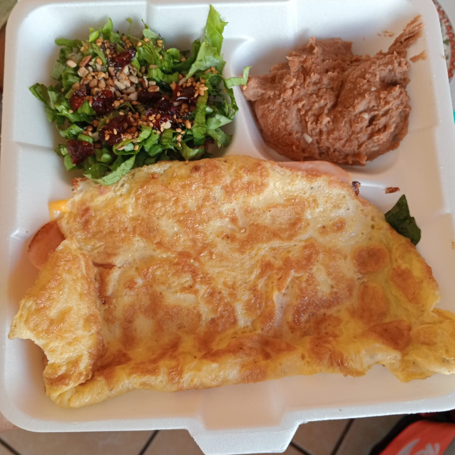 Omelette relleno con jamón, queso panela, queso amarillo y espinaca.
