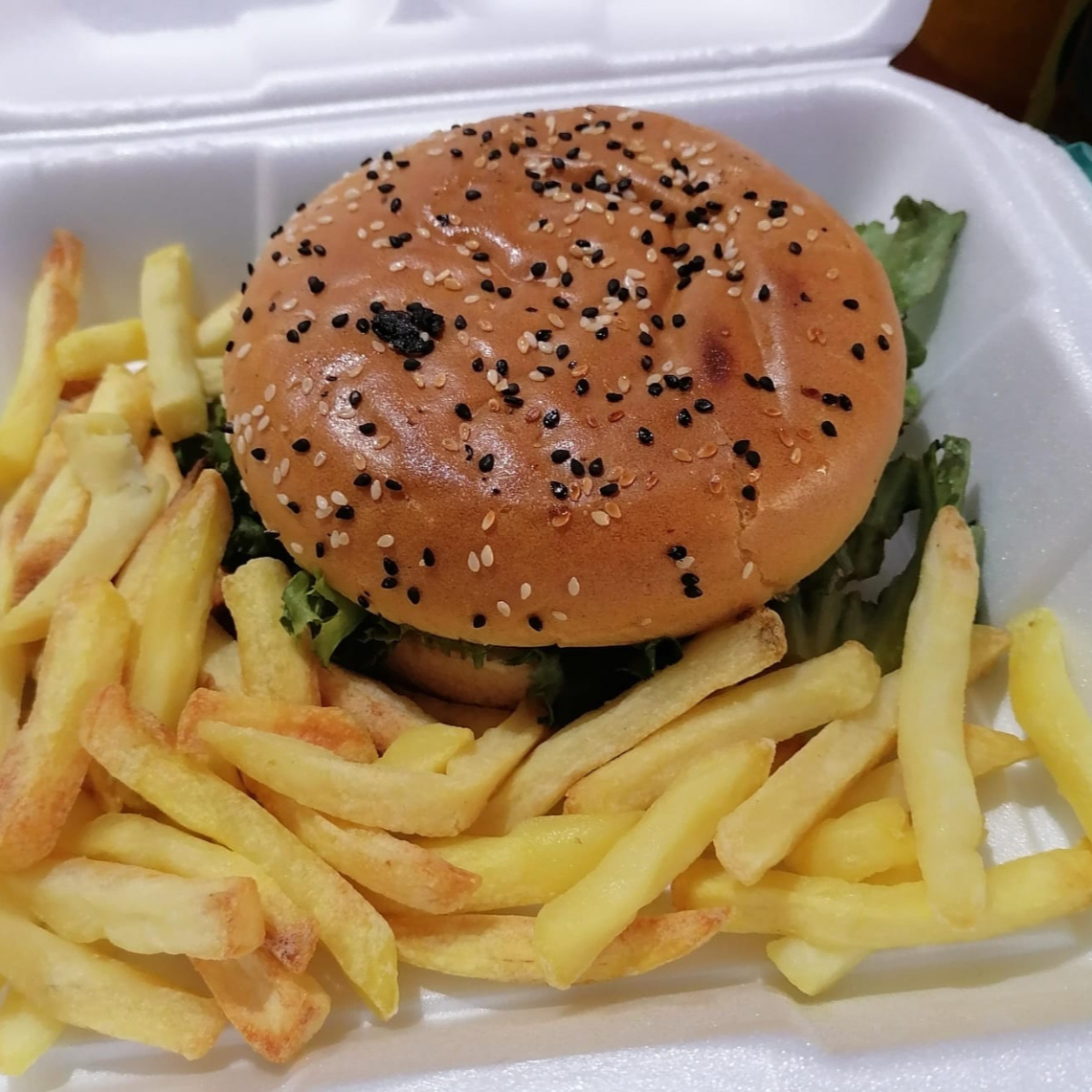Hamburguesa de arrachera con vegetales frescos y papas fritas.