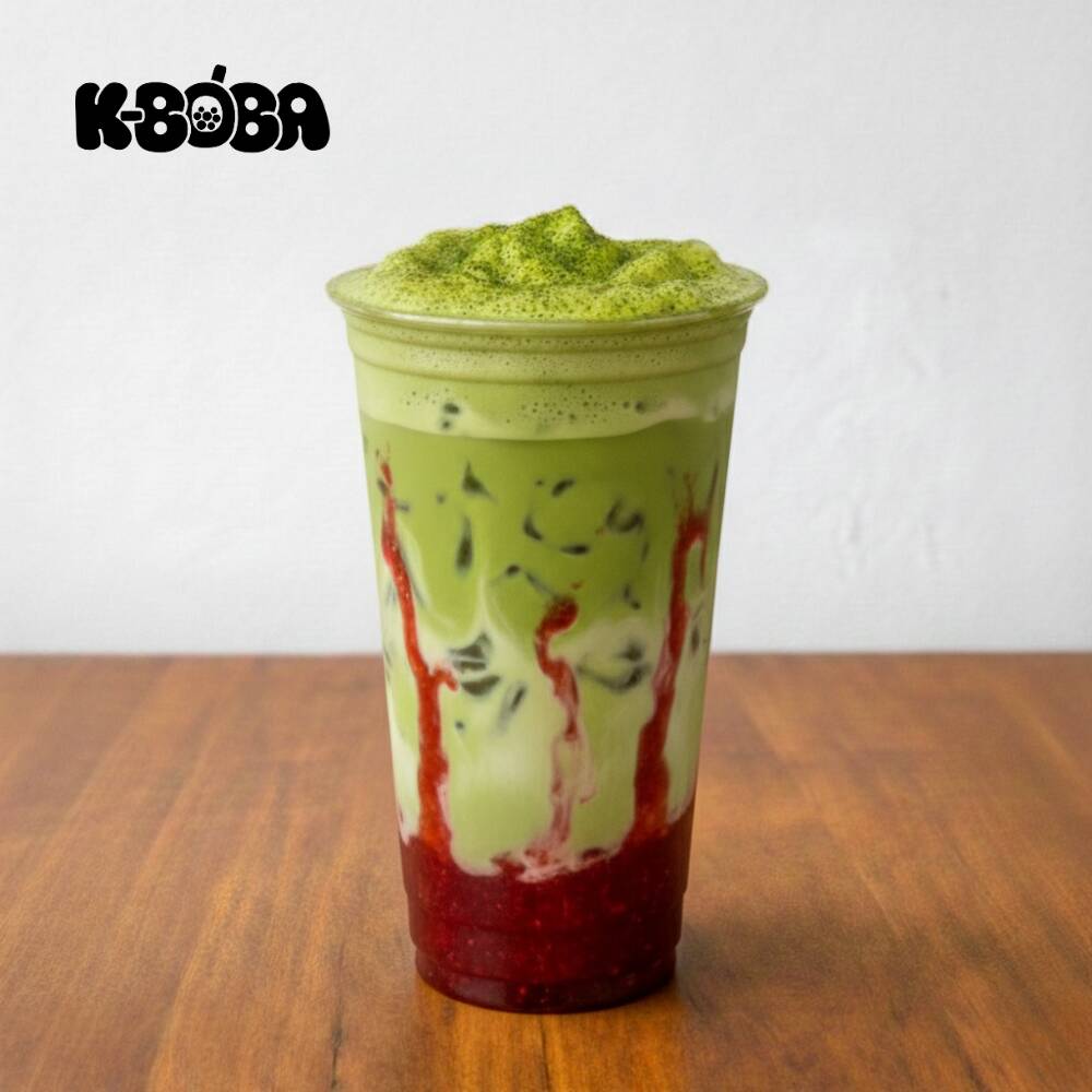 Bebida fría de 24 oz. servida sobre hielo, elaborada a base de leche, polvo de matcha y mermelada de fresa.