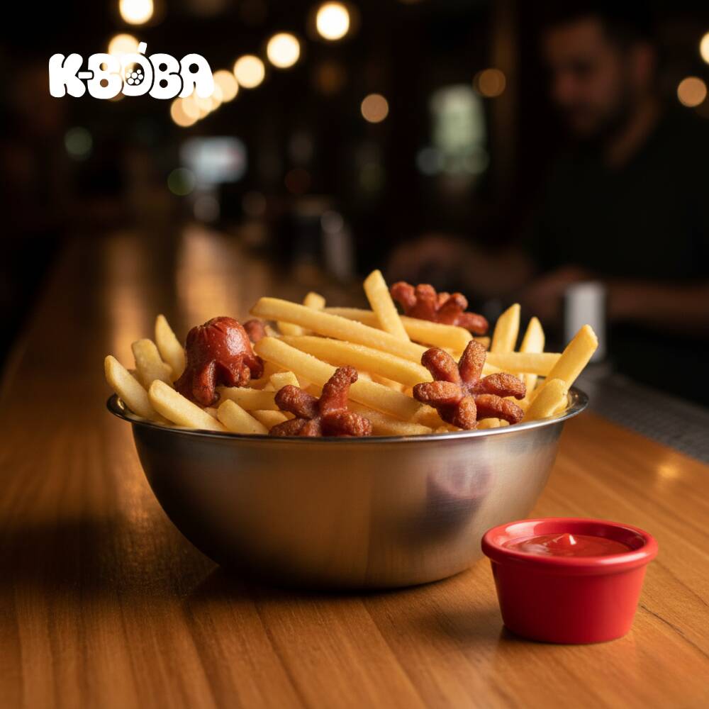 Producto elaborado a base de papa cortada en bastones y frita hasta obtener una textura crujiente por fuera y suave por dentro, acompañado de salchipulpos dorados.