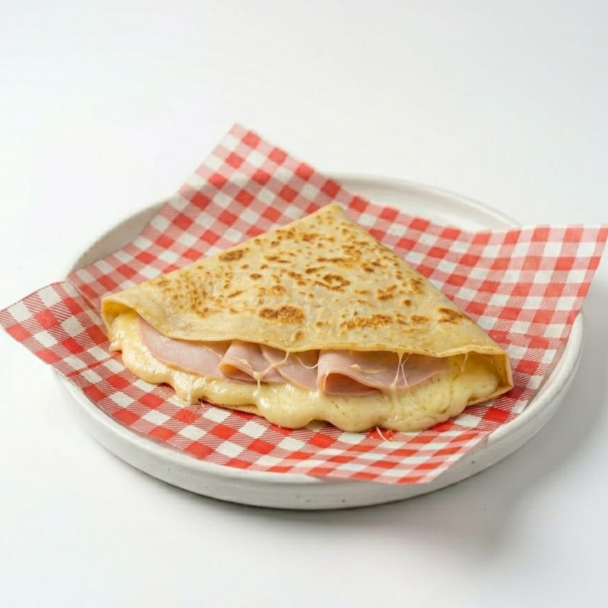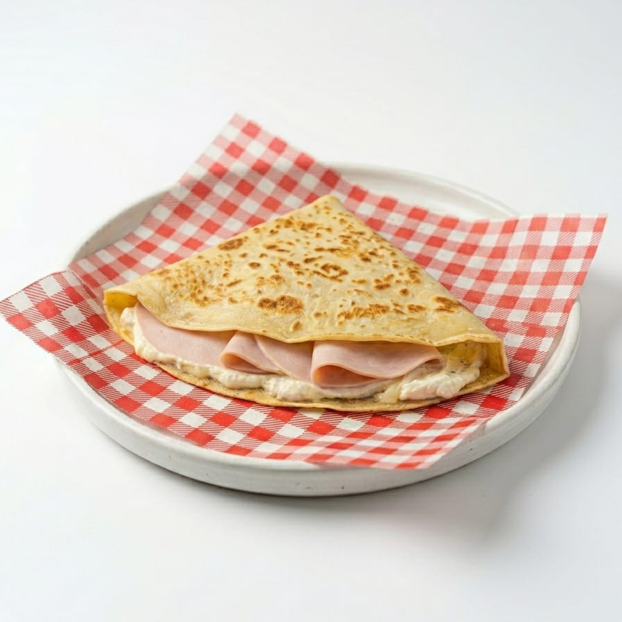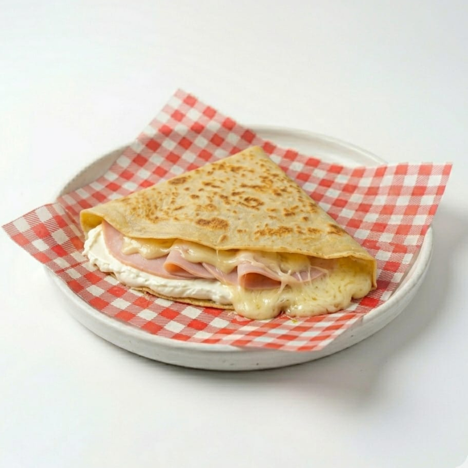 Crepa acompañada de Queso Crema, Queso manchego y Jamón de pavo