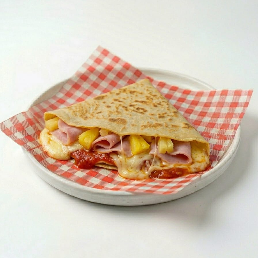 Crepa acompañada de queso manchego, jamón de pavo, piña y salsa de tomate de la casa