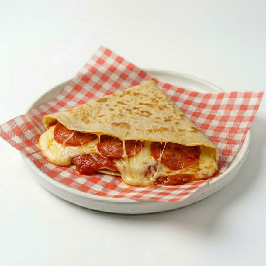 Crepa acompañada de queso manchego, pepperoni y salsa de tomate de la casa