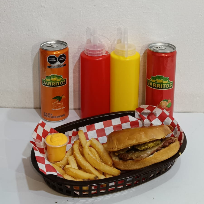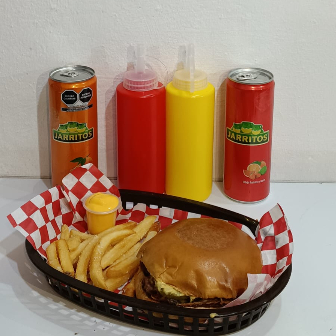 2 discos de carne smash (70 g c/u), queso manchego, mermelada de tocino, pepinillos y aderezo a elegir, en un pan brioche. Incluye 100 g de papas fritas.