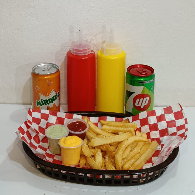 3 discos de carne smash (70 g c/u), queso americano, cebolla caramelizada, pepinillos y aderezo smash en pan brioche. Incluye 150 g de papas fritas.