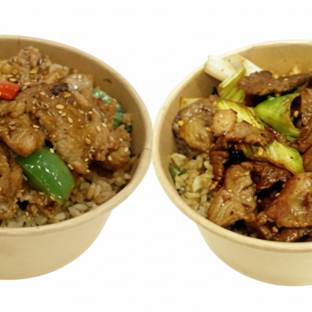Dos recipientes con chow fan, chow mein o tiras de papa a elegir más 2 especialidades a elegir más 1 rollo primavera más 2 dumplings.