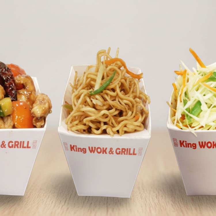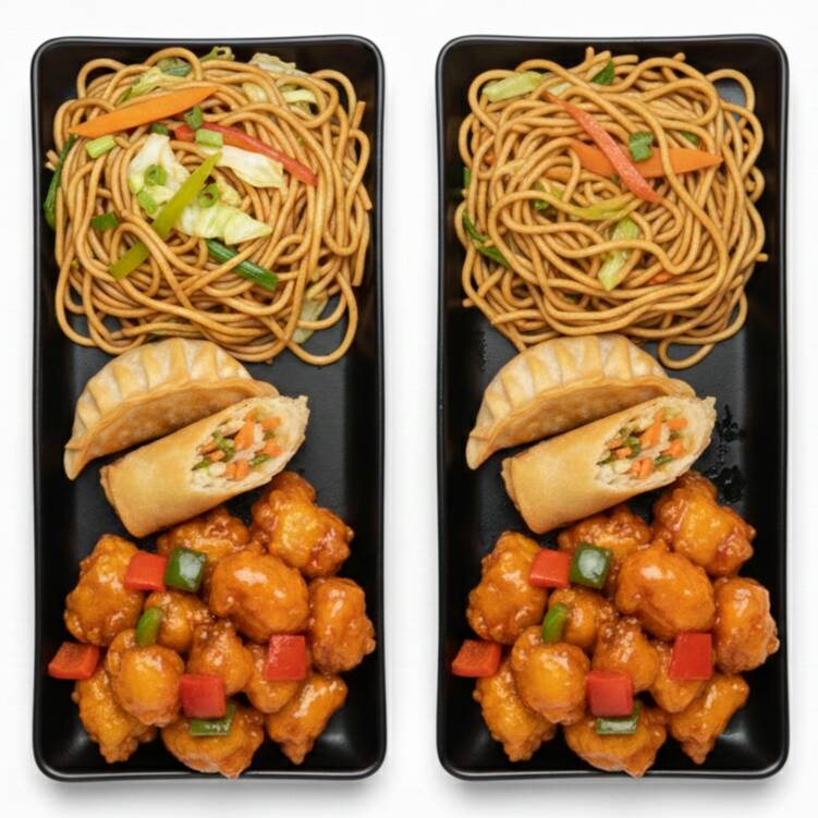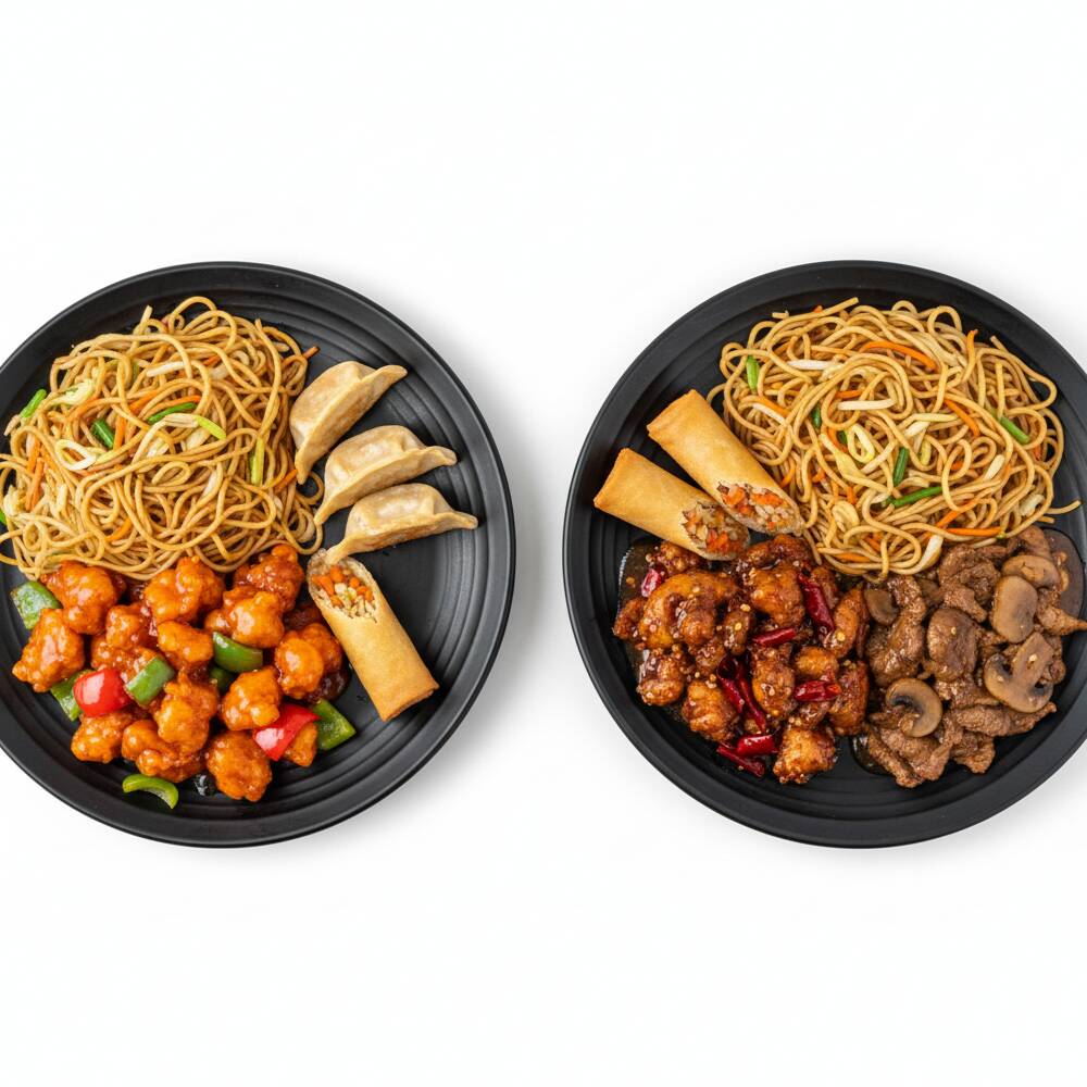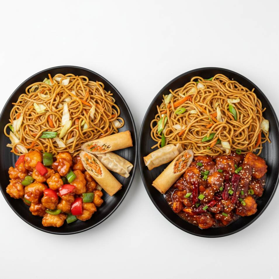 Dos recipientes con chow fan, chow mein o tiras de papa a elegir más 3 especialidades a elegir más 1 rollo primavera más 3 dumplings.