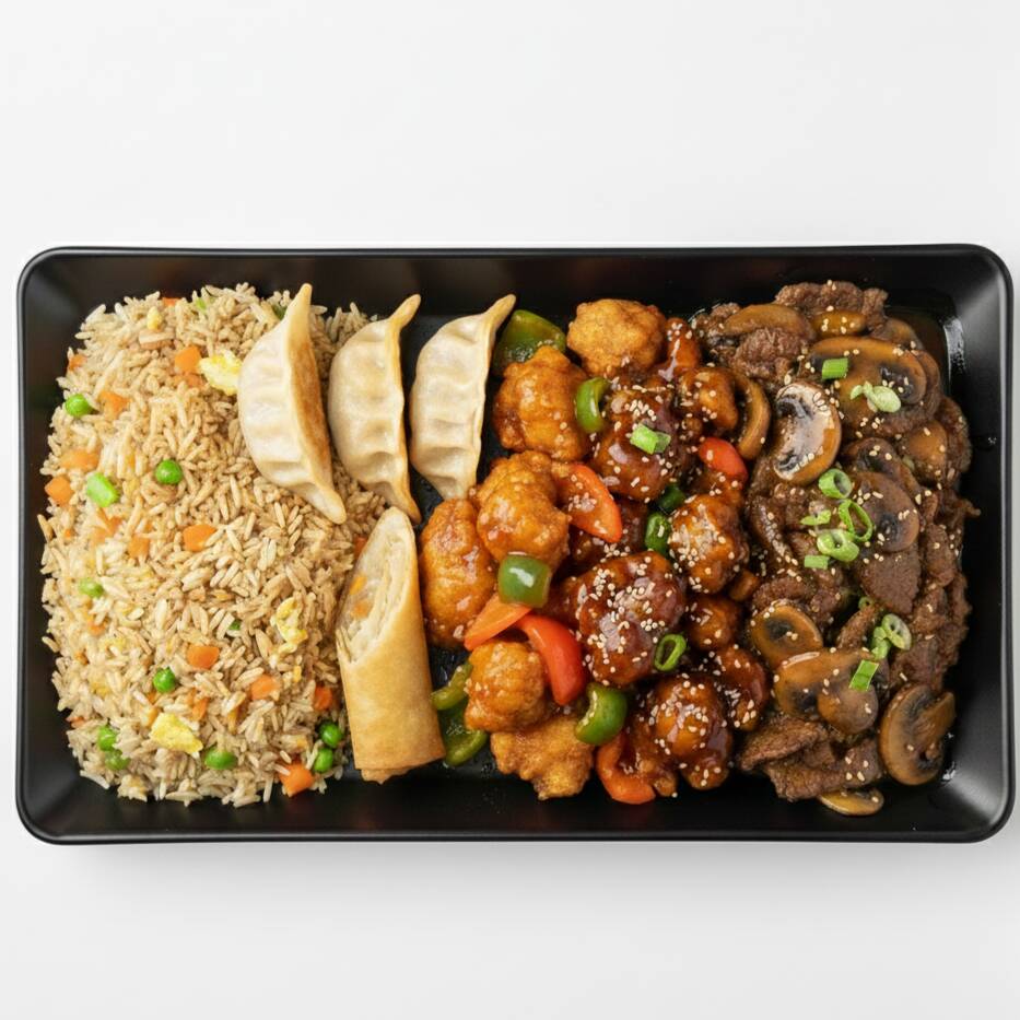 Chow fan, chow mein o tiras de papa a elegir más 3 especialidades a elegir más 1 rollo primavera más 3 dumplings.