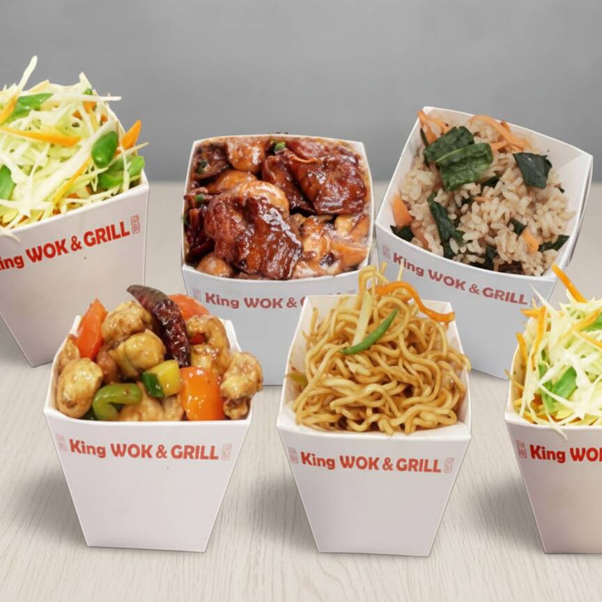 6 china box con yakimeshi o arroz al vapor o chow mein a elegir más 2 especialidades a elegir más 2 ensaladas.