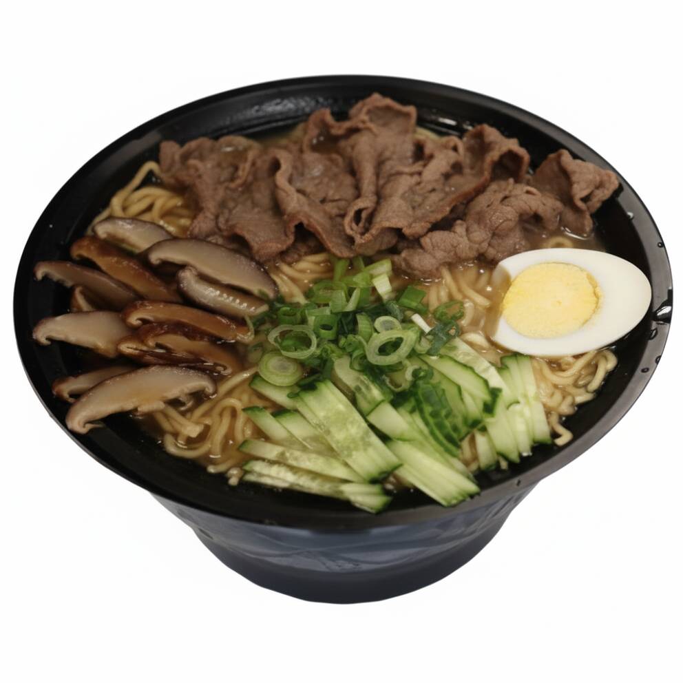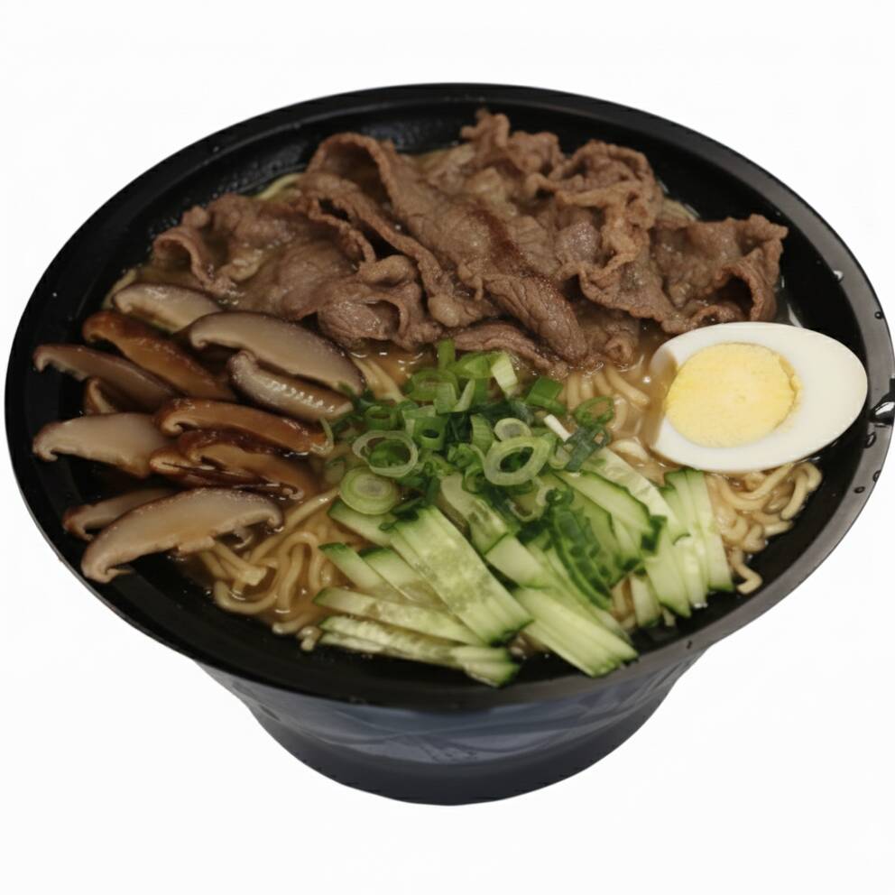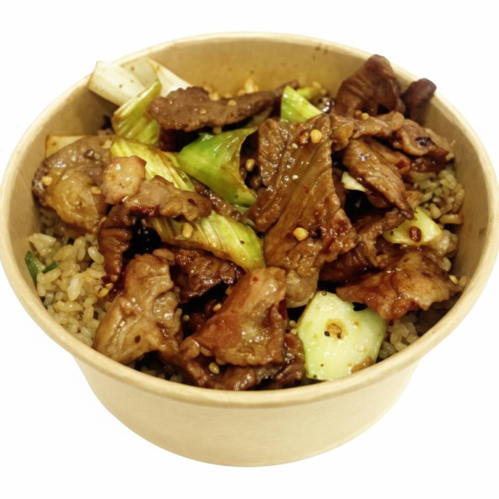 Tazón con fondo especial de la casa, acompañado de verduras frescas y laminas de res como proteína.
