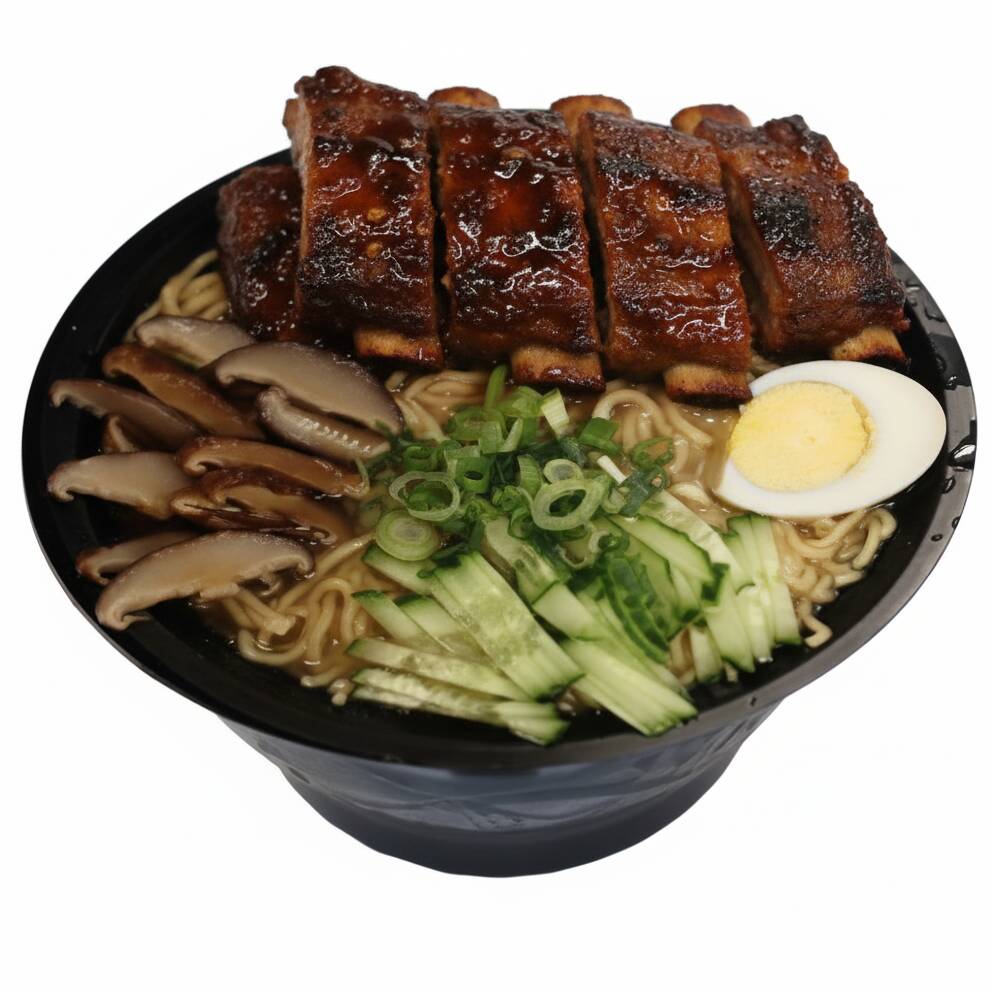 Tazón con fondo especial de la casa, acompañado de verduras frescas y costilla como proteína.