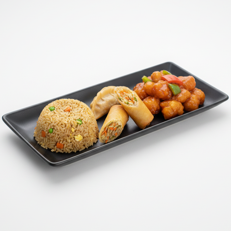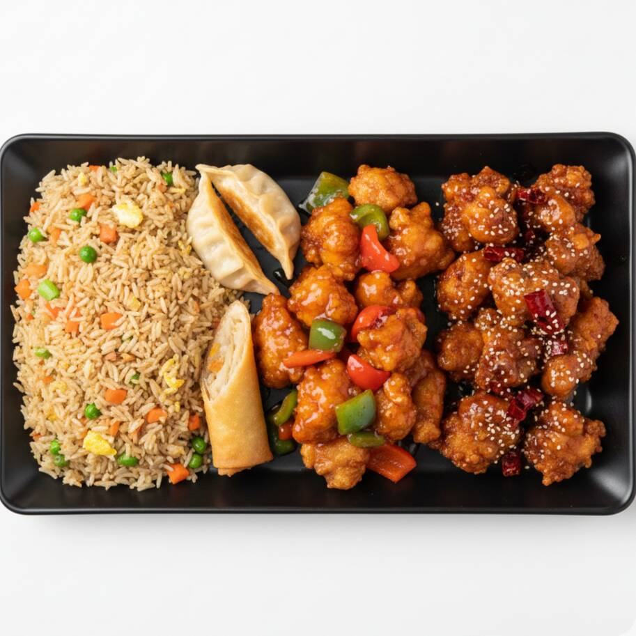 Chow fan, chow mein o tiras de papa a elegir más 2 especialidades a elegir más 1 rollo primavera más 2 dumplings.
