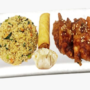 Dos recipientes con chow fan, chow mein o tiras de papa a elegir más 1 especialidad a elegir más 1 rollo primavera más 1 dumpling.