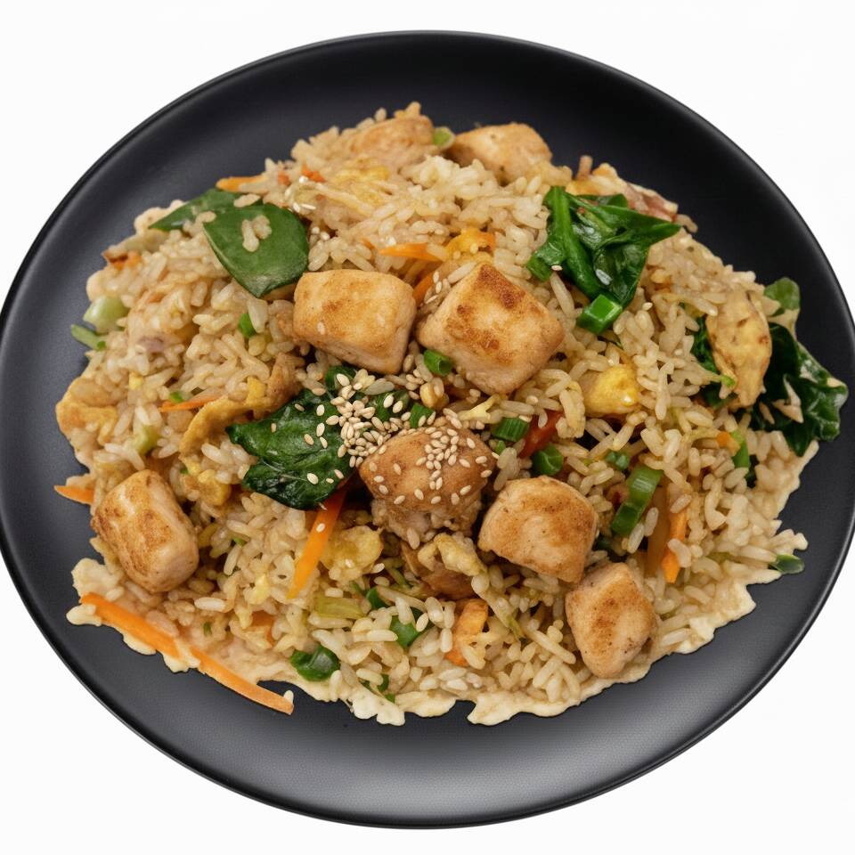 Delicioso arroz o fideos vegetarianos al wok, con proteína de pollo.
