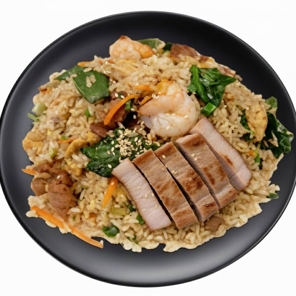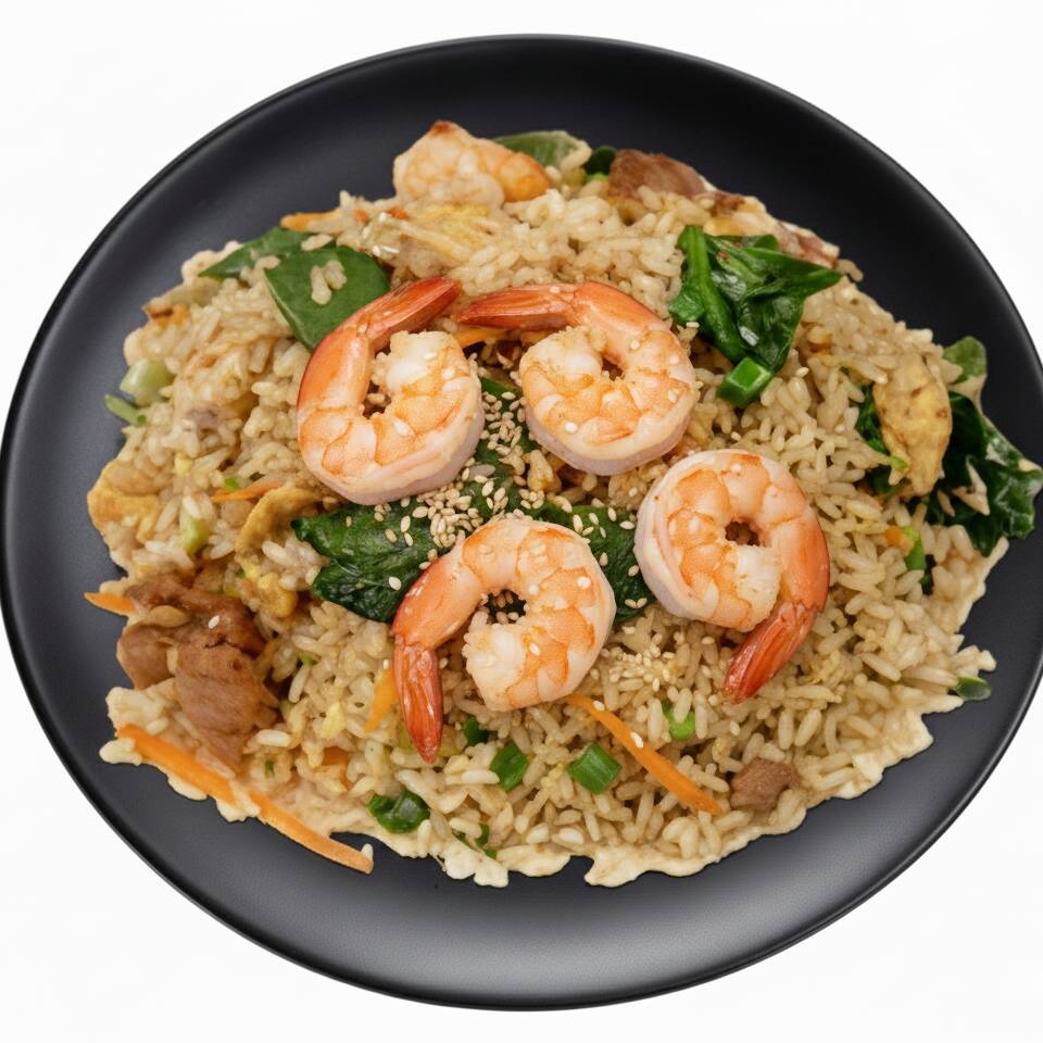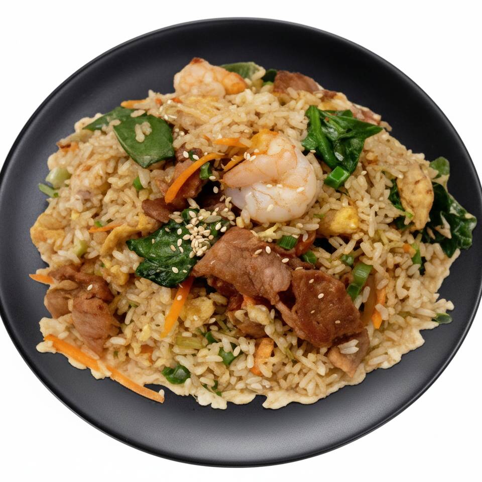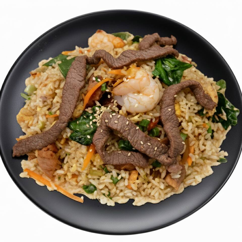 Delicioso arroz o fideos vegetarianos al wok, con camarón, res y pollo como proteína.