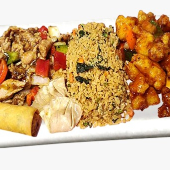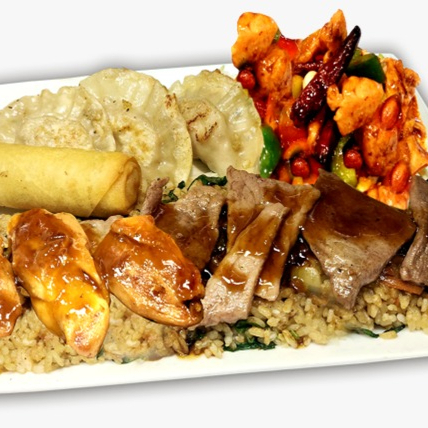 Chow fan o Ramen al Wok o Arroz al Vapor + 3 especialidades a elegir + 1 rollo primavera + 3 Ravioles.