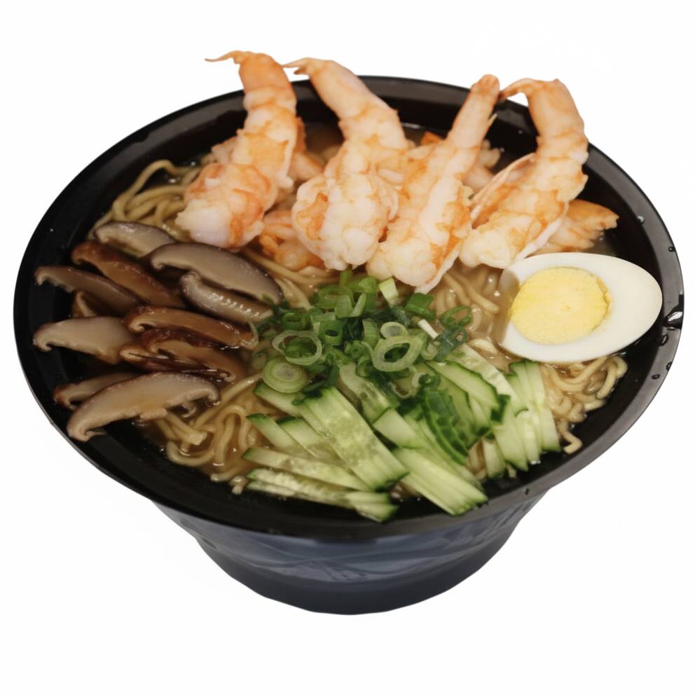 Tazón con fondo especial de la casa, acompañado de verduras frescas y camarón como proteína.
