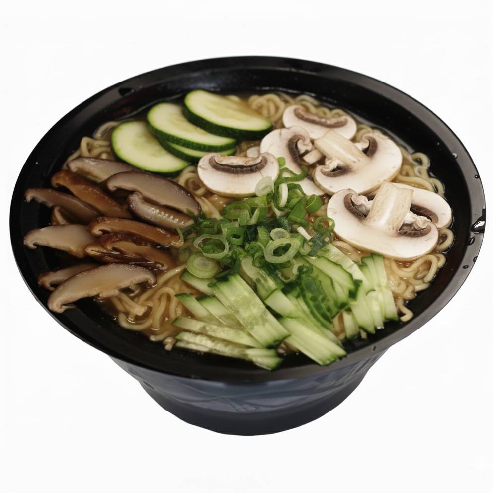 Tazón con fondo especial de la casa, acompañado de verduras frescas.