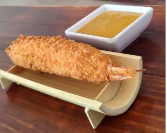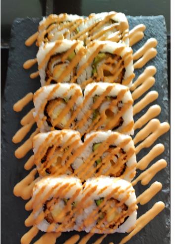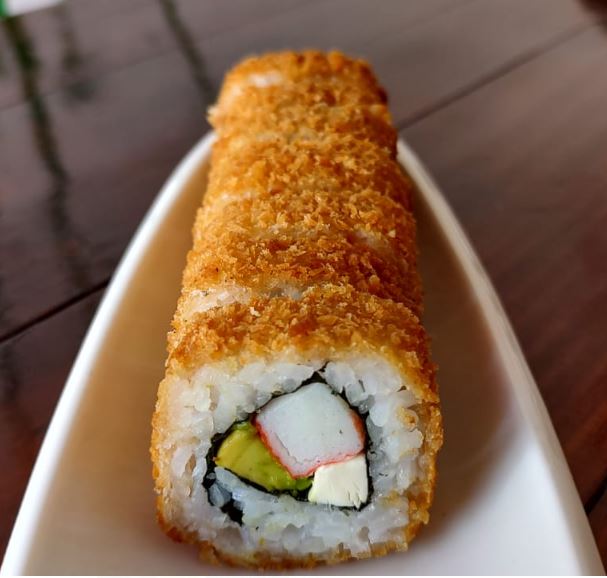 Camarón tempura, queso crema y aguacate, bañado con aderezo de chipotle.