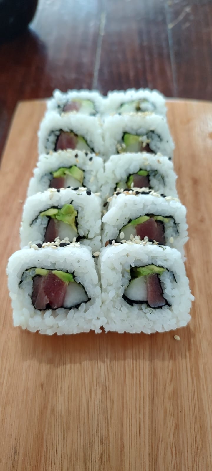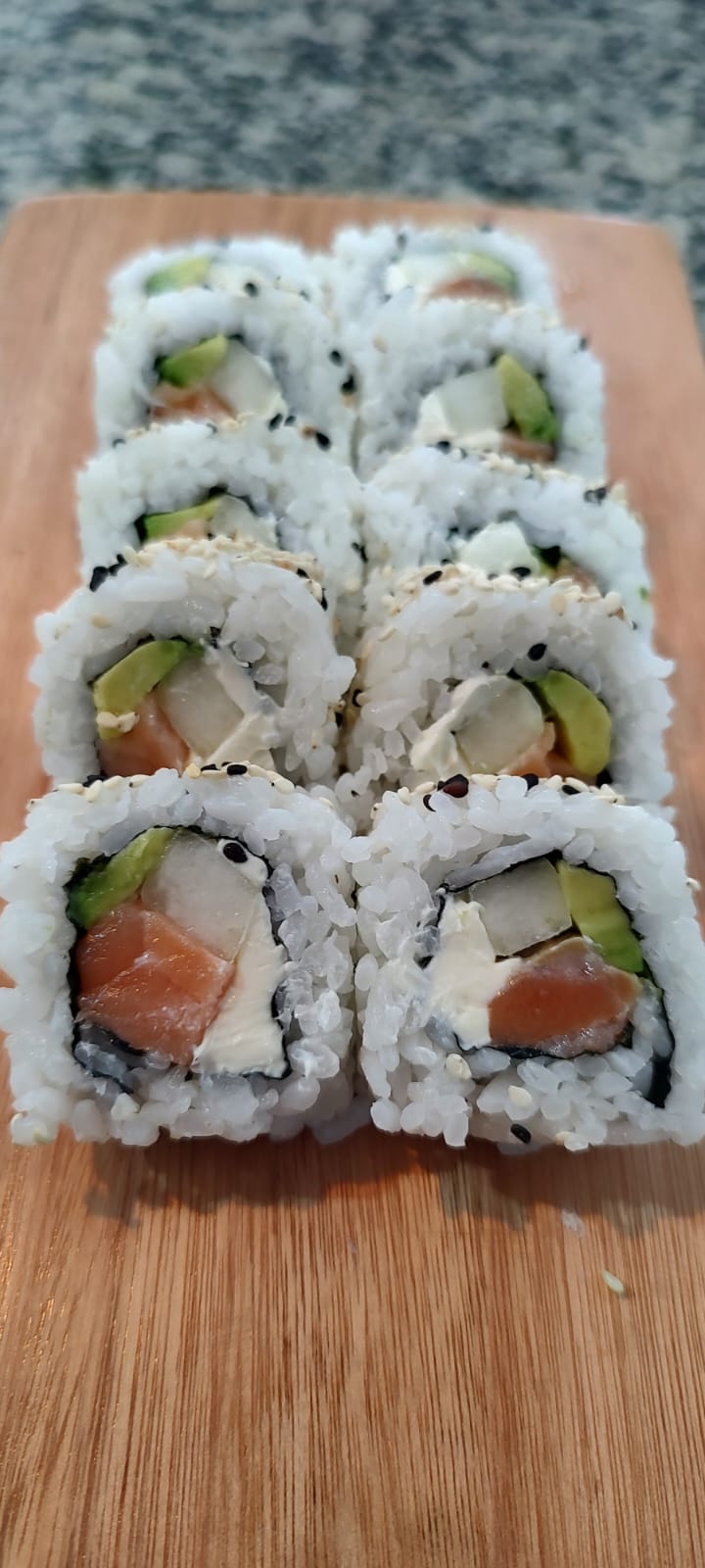 Samón, queso crema, pepino, aguacate y ajonjolí por fuera.