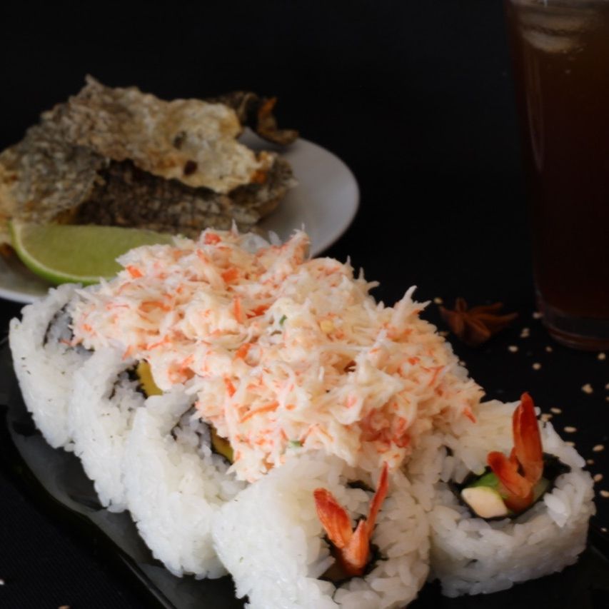 Camarón, queso crema, pepino, aguacate y ajonjolí por fuera.