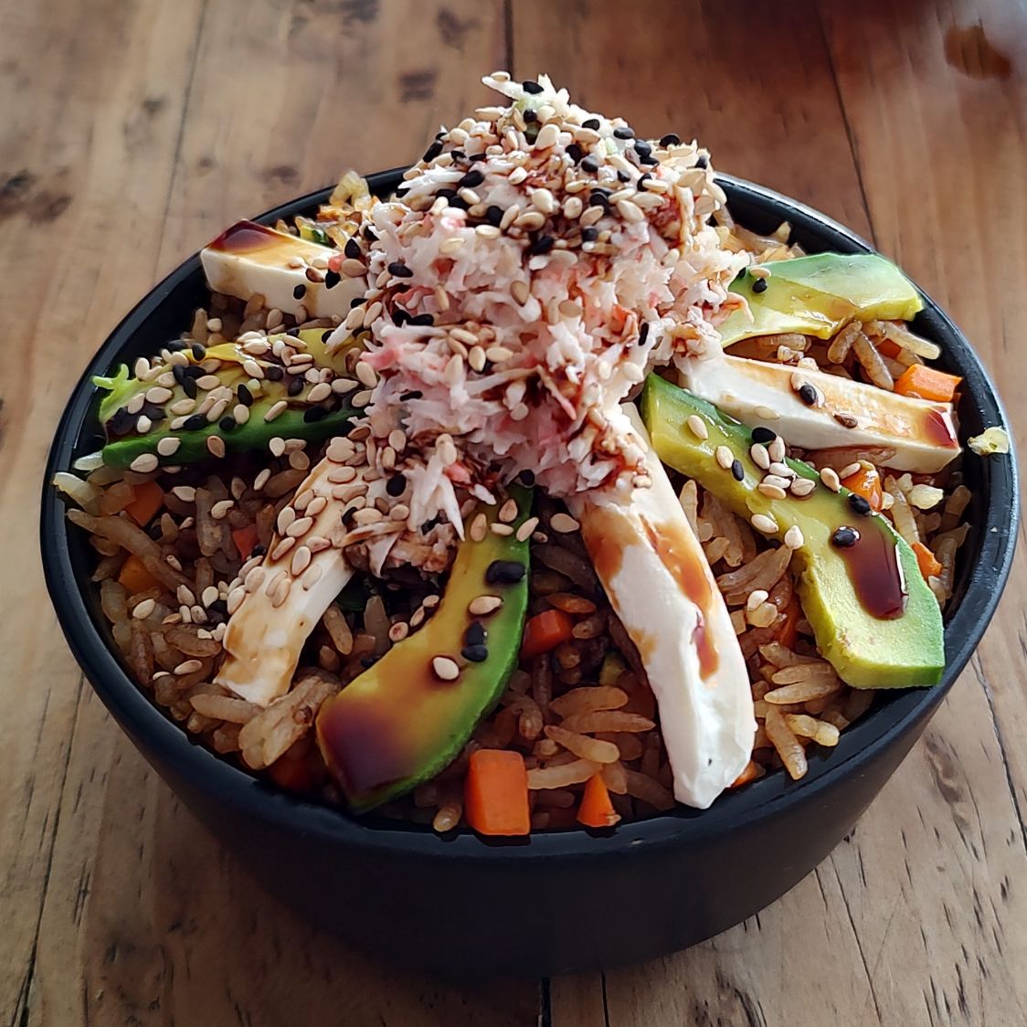 Arroz frito con verduras y huevo. La proteína de tu elección, aderezo de chipotle, aguacate, queso crema, tampico, ajonjolí y salsa de anguila.