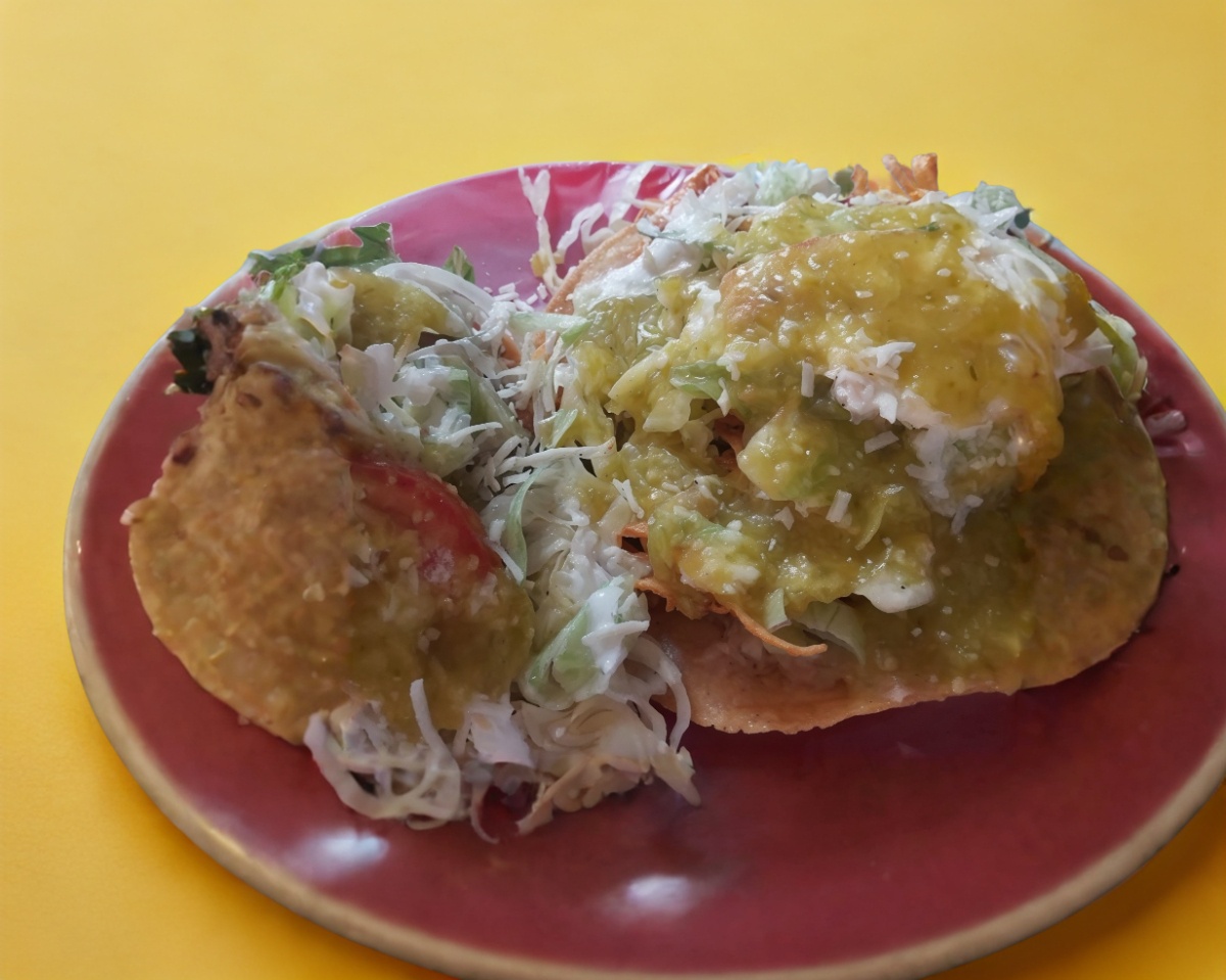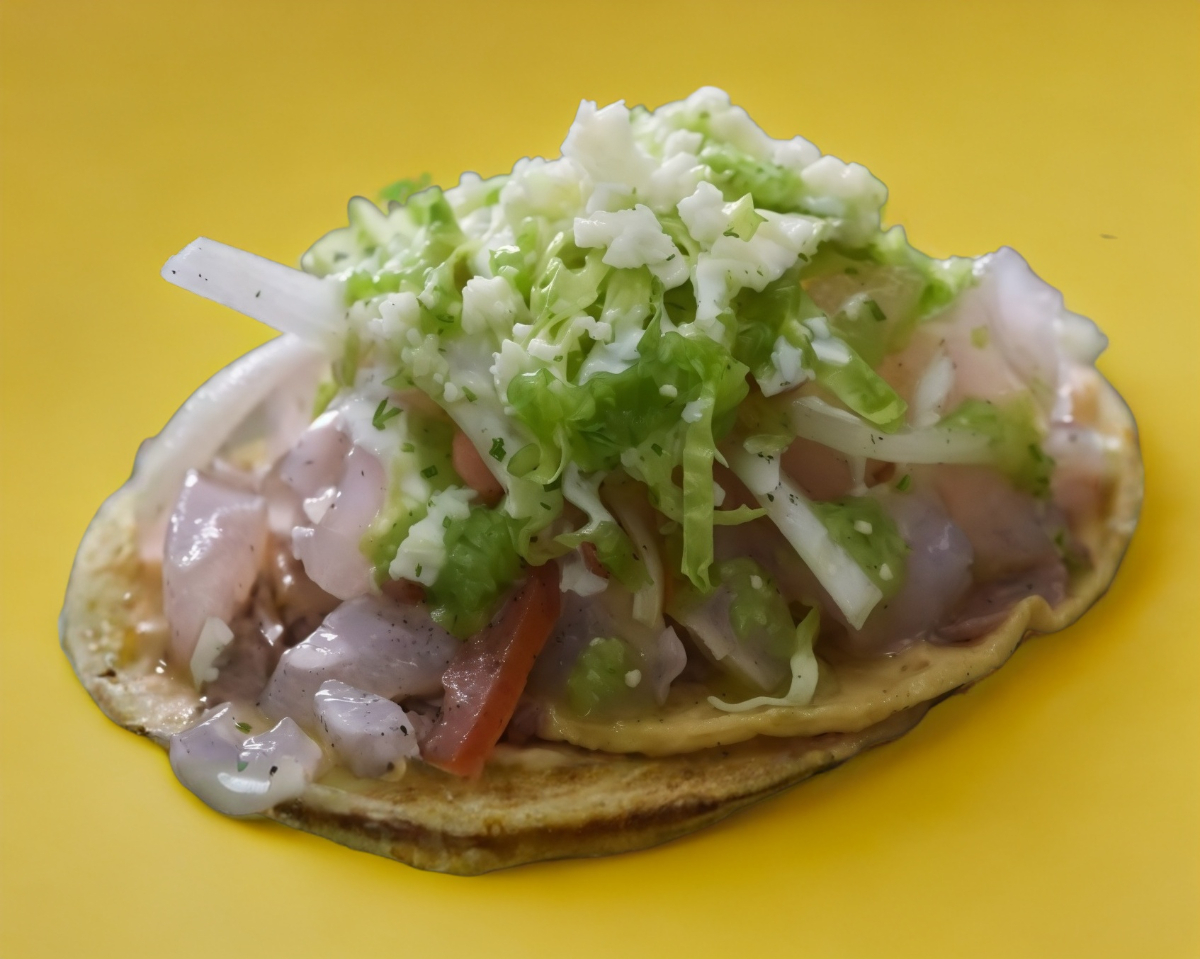 1 tostada con picadillo de res, acompañada con crema, queso, lechuga, jitomate y cebolla.