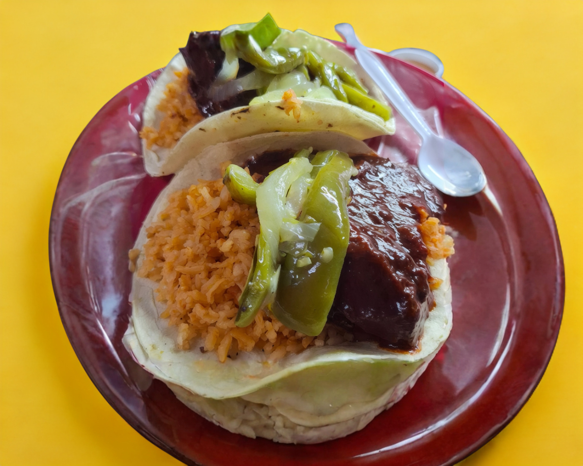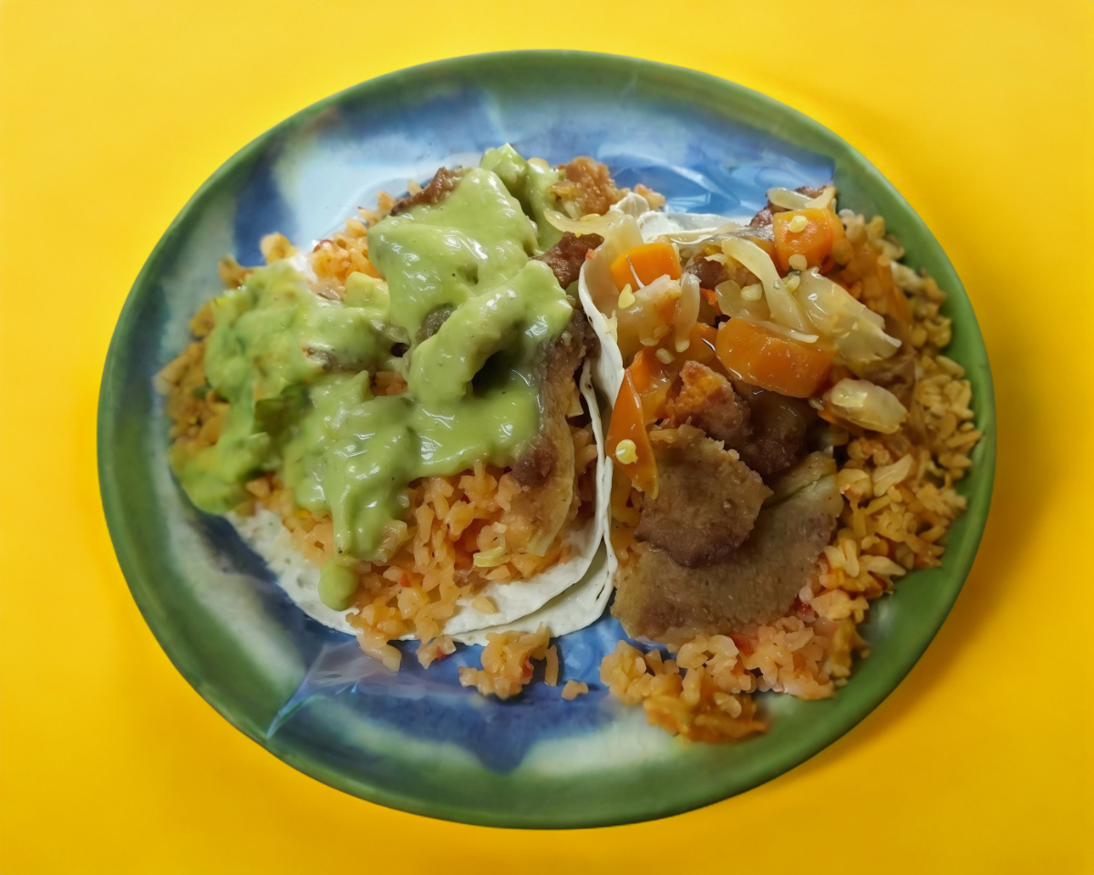 Taco grande (2 tortillas) con arroz y cerdo en adobo.