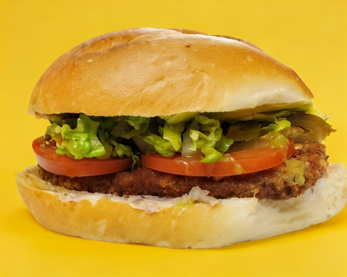 Torta de milanesa de pollo con mayonesa, lechuga y jitomate.