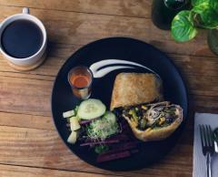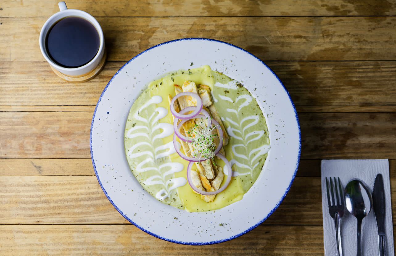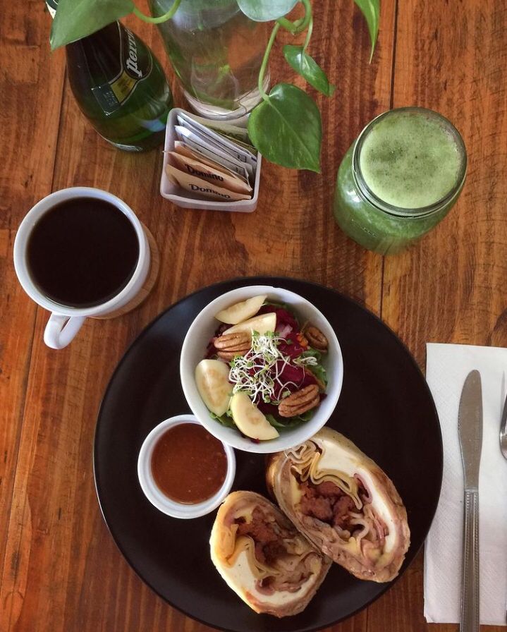 Relleno de mix de quesos, pimientos salteados con cebolla, pimientos, espinacas, elote amarillo y champiñones servidos con ensalada de la casa, incluye café y fruta.