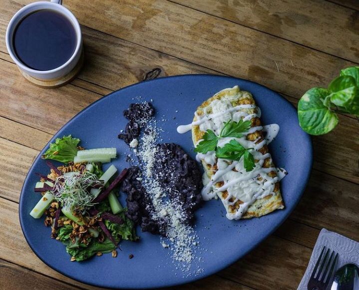 Omelette de 5 claras de huevo con queso oaxaca y espinacas, servido con puré de frijol y ensalada, incluye café y fruta de 9 am a 2 pm.