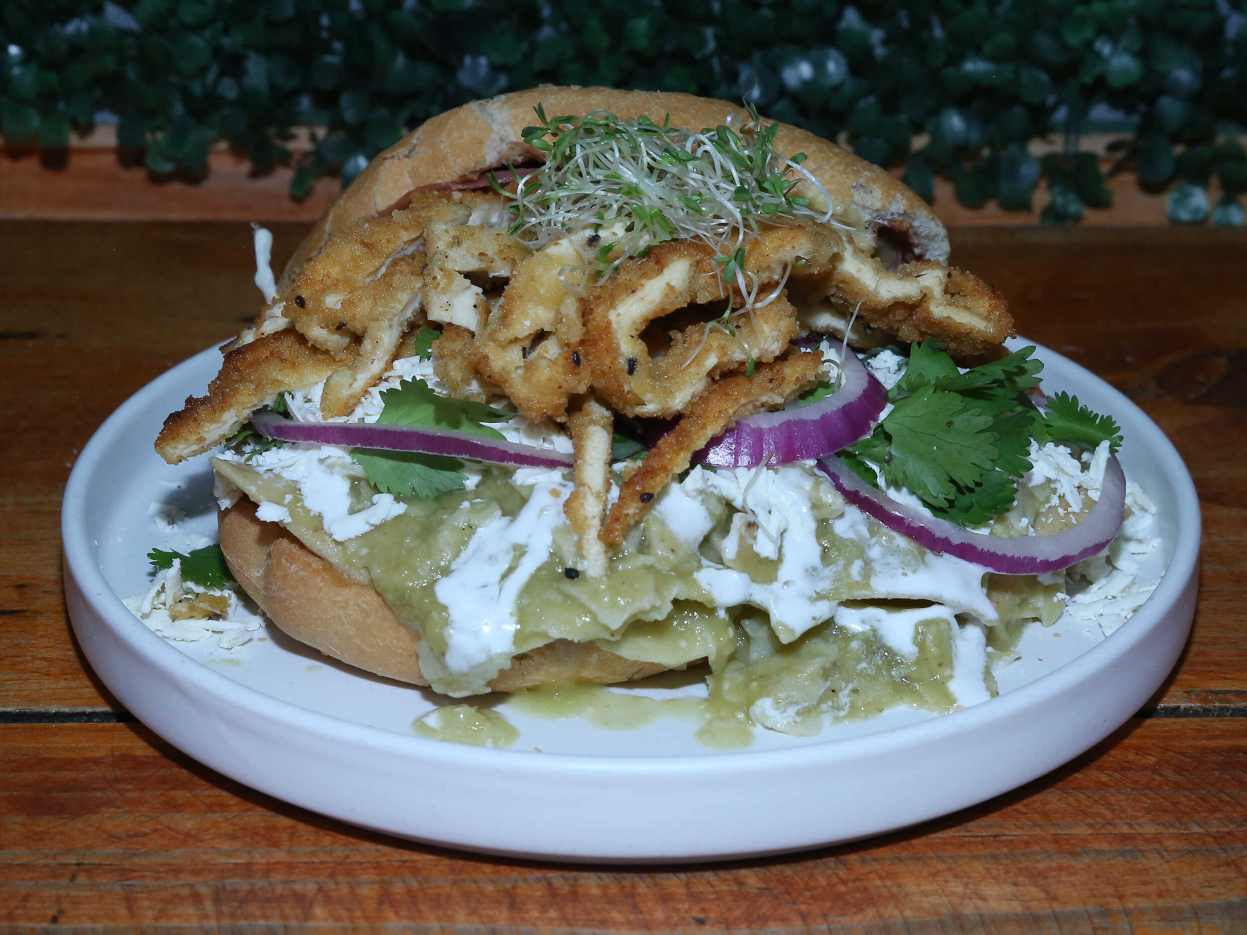 Torta de chilaquiles y pechuga de pollo empanizada. Incluye café y fruta solo de 9am a 2pm