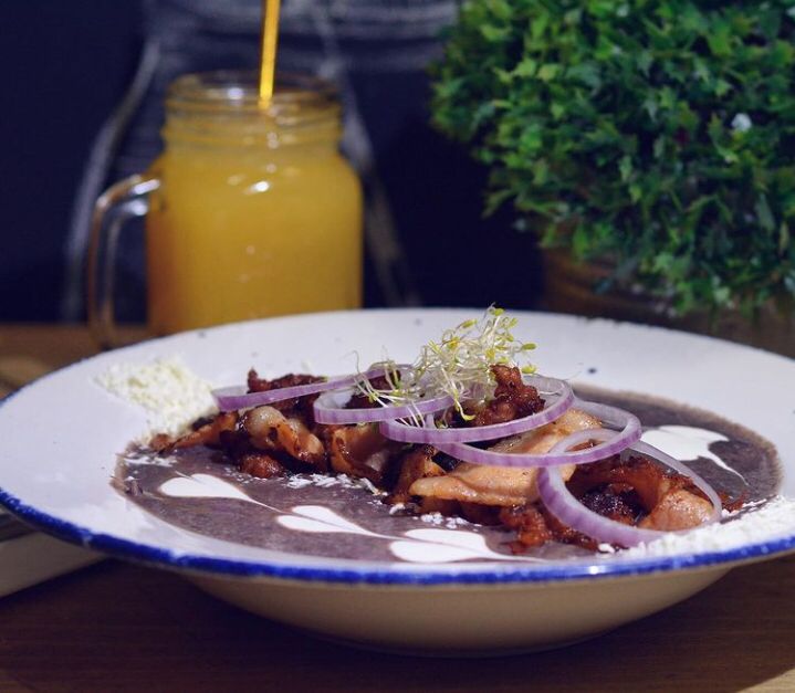 4 Tortillas rellenas de queso oaxaca, cubiertas con salsa de frijol picante, servidas con chorizo tipo español y tocino, incluyen café y fruta solo de 9 am a 2 pm