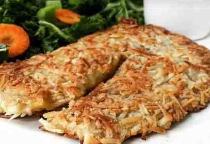 Filete de tilapia empanizado con coco, guarnición y ensalada del día, de 2 pm a 6 pm se incluye agua del día, sopa y postre.