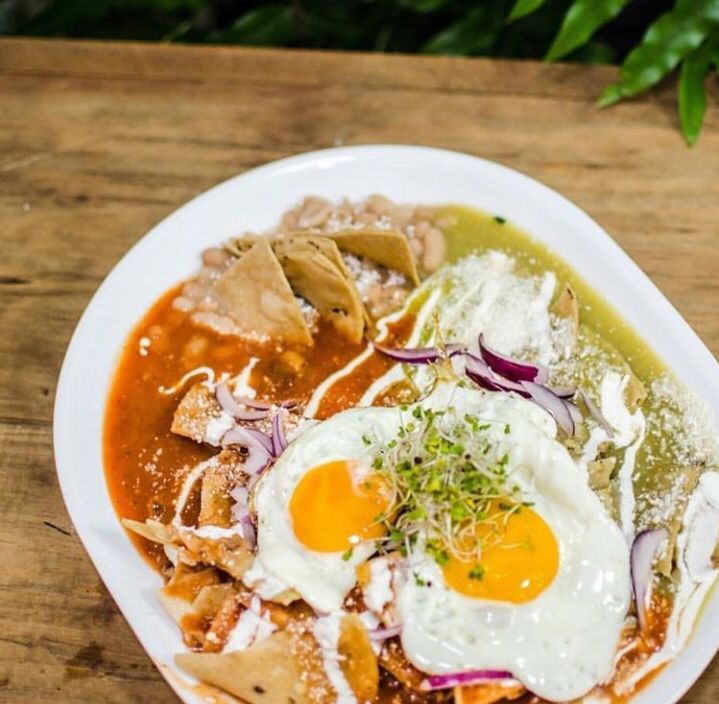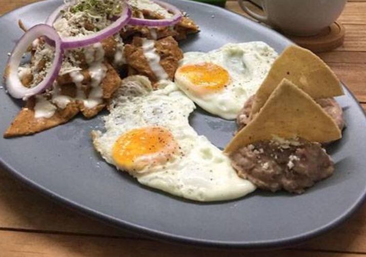 Chilaquiles verdes o rojos, servidos con frijoles refritos y nopales, incluye café y fruta de 9 am a 2 pm