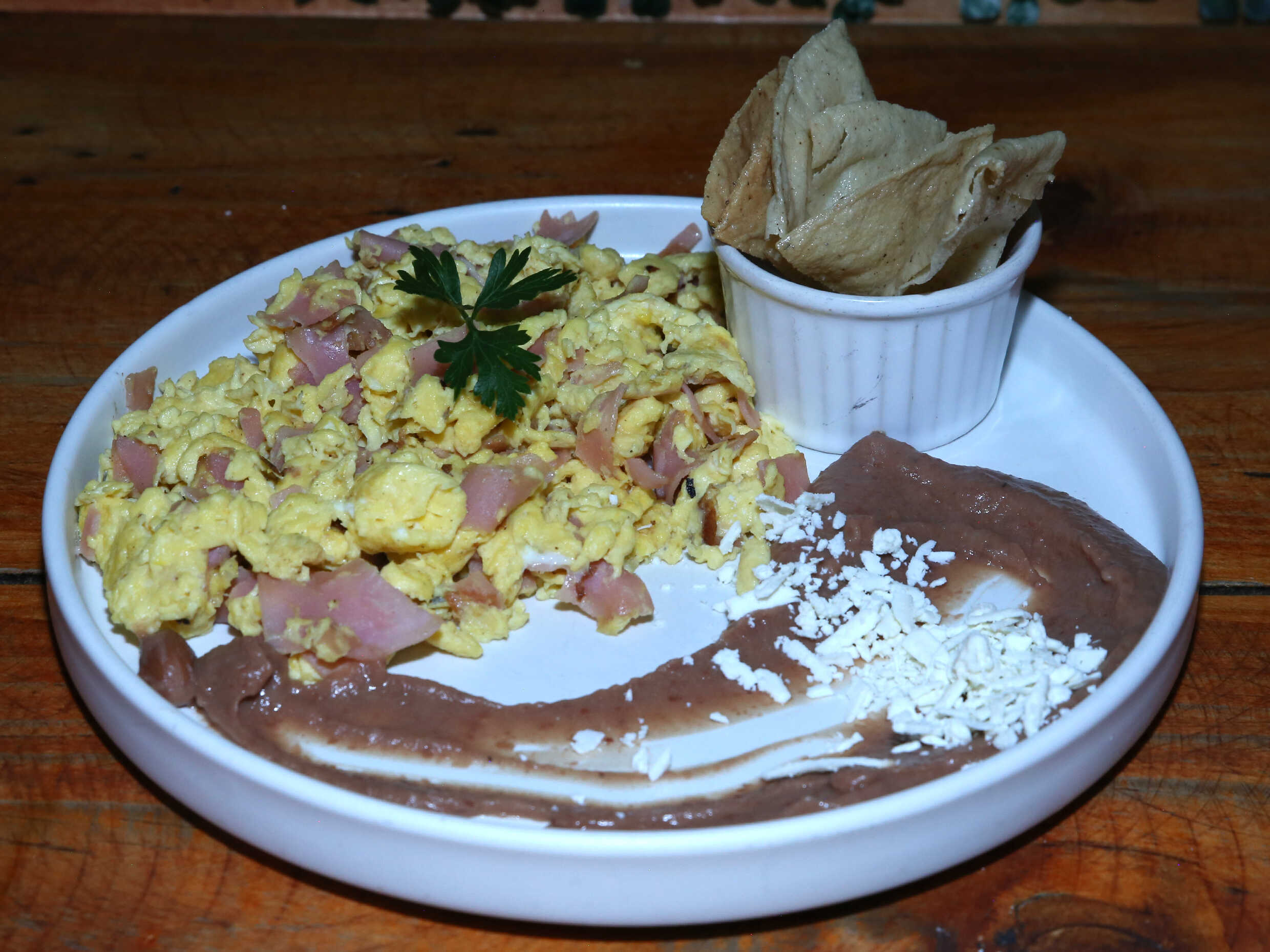 Servido con frijoles refritos y pan, incluye café y fruta de 9 am a 2 pm
