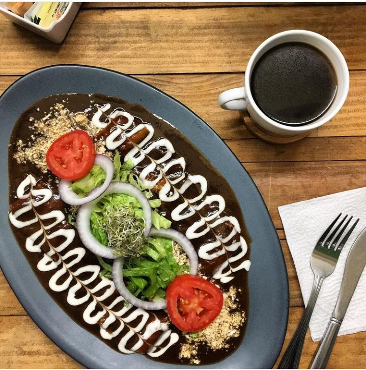 4 Tortillas rellenas de queso oaxaca, cubiertas con mole dulce y acompañadas de frijoles refritos, servida de pechuga a la plancha, incluyen café y fruta solo de 9 am a 2pm