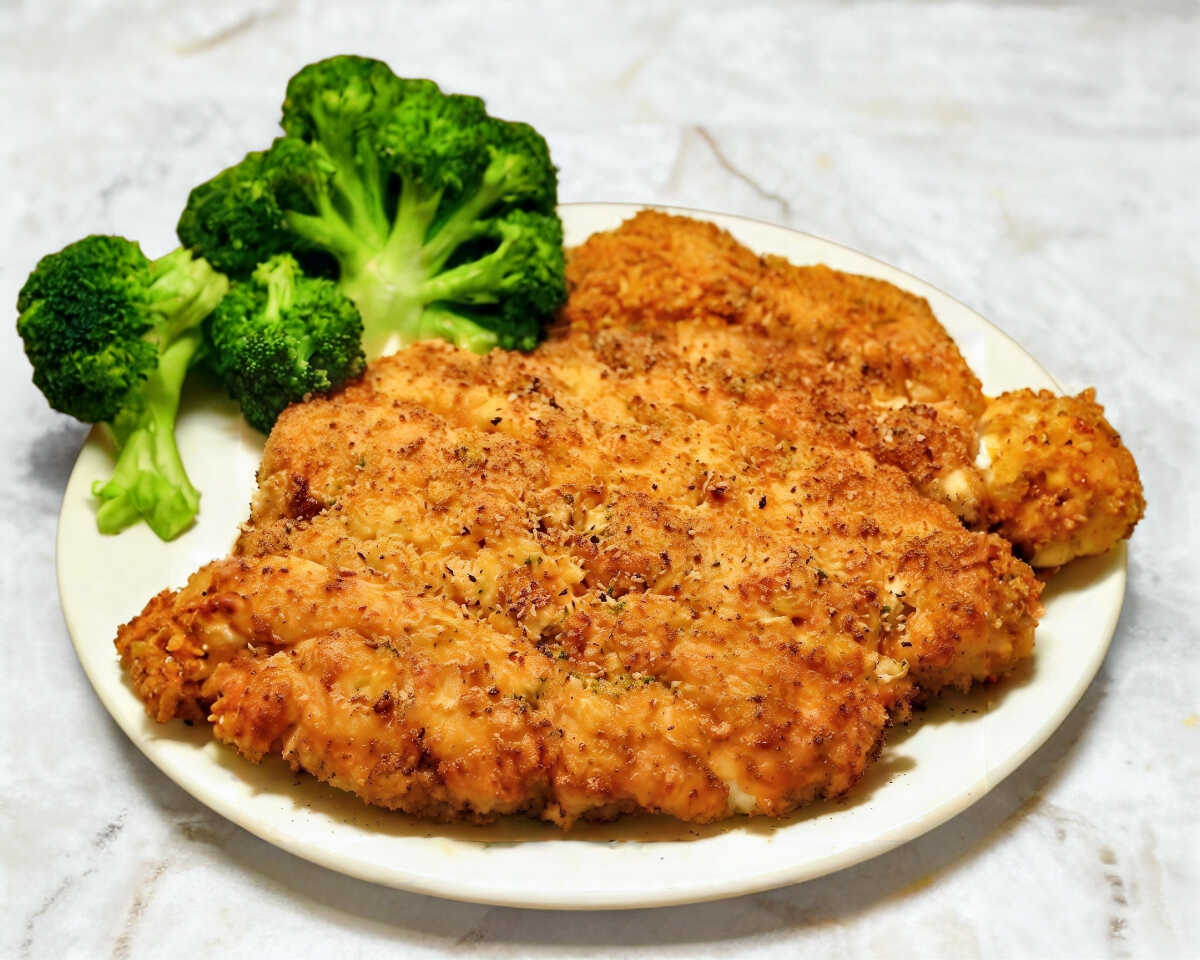 Pechuga empanizada con pan molido hecho en casa, guarnición de ensalada y guarnición del día, de 9 am a 2 pm se incluye café y fruta, así como de 2 pm a 6 pm solo se incluye agua del día, sopa y postre.