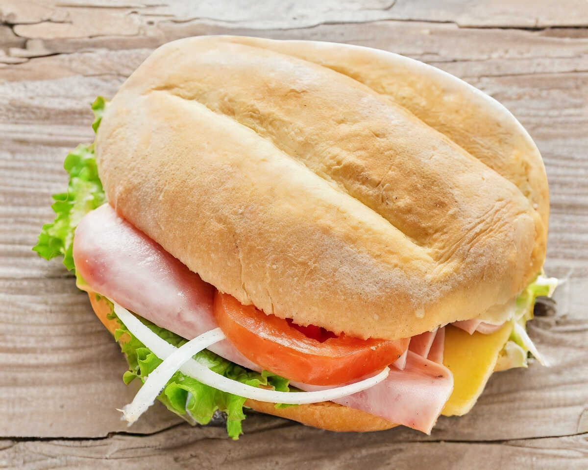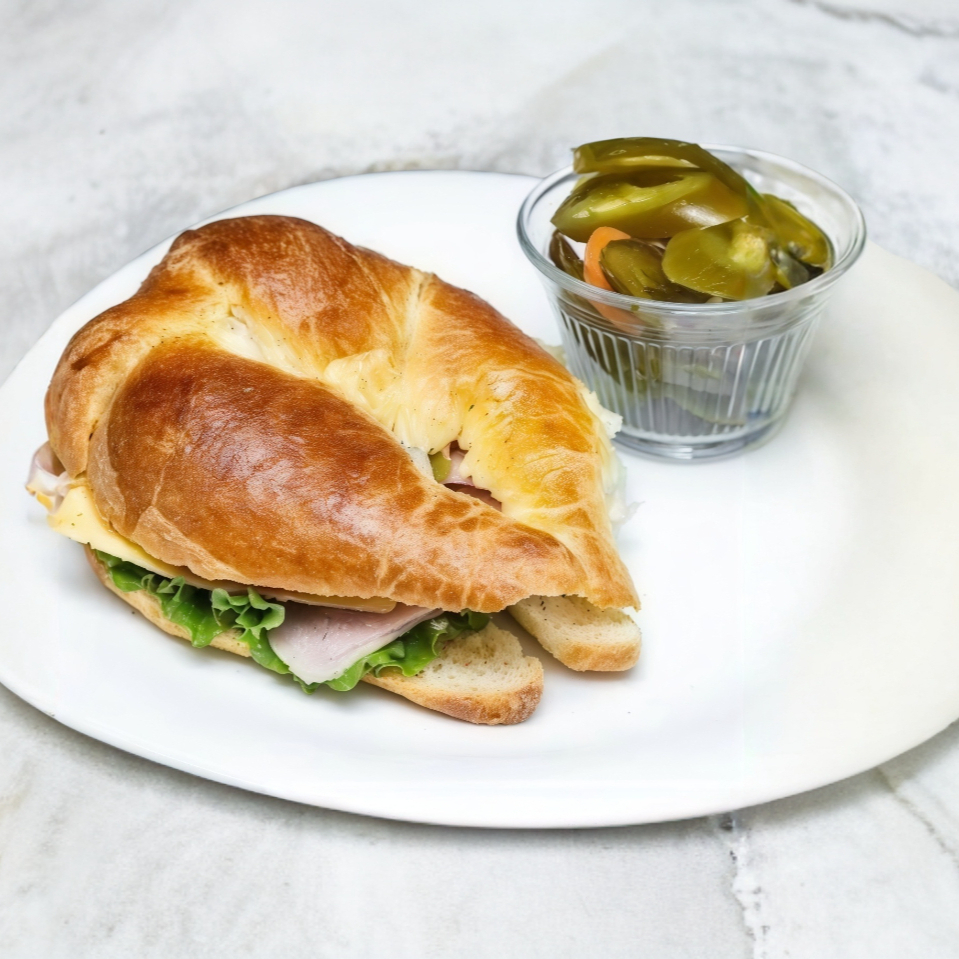 Cuernito rellenomde jamón de pavo , queso manchego, Lechuga, cebolla , jitomate y chiles en vinagre
