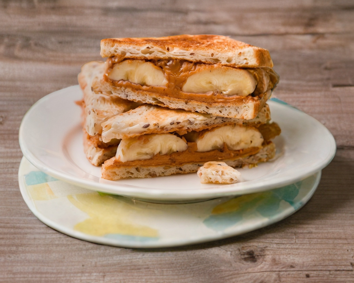 Relleno de crema de cacahuate y platano . Tostado y espolvoreado con un toque de azucar y canela