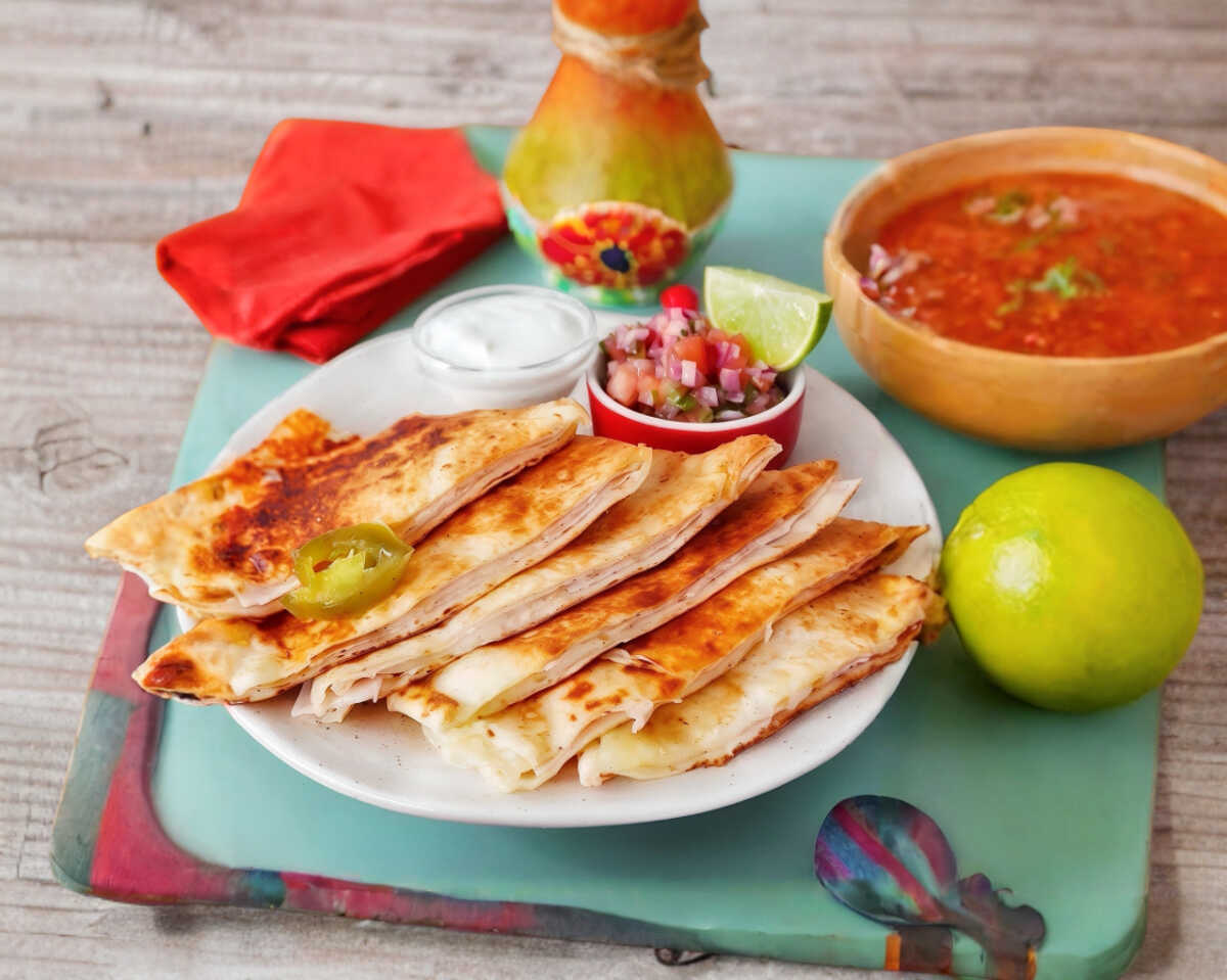 Dos tortillas de harina rellenas de jamón queso manchego y pico de gallo