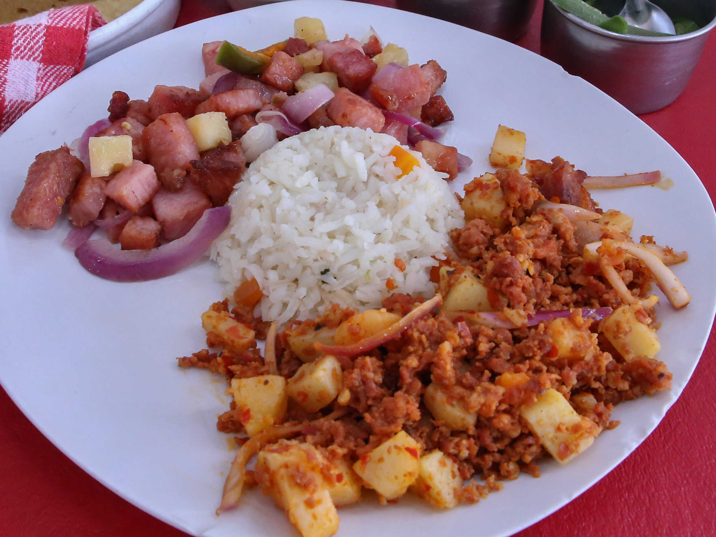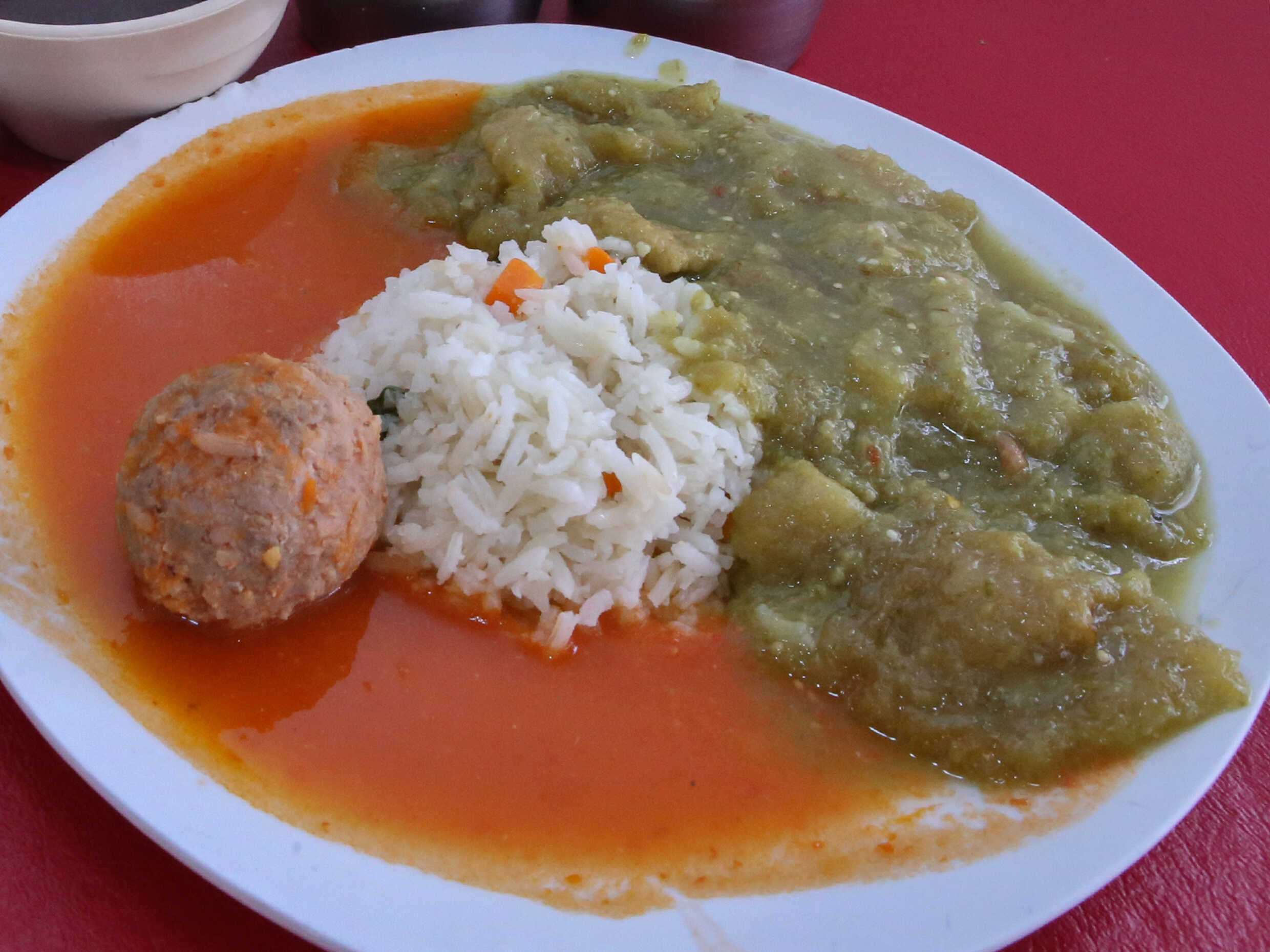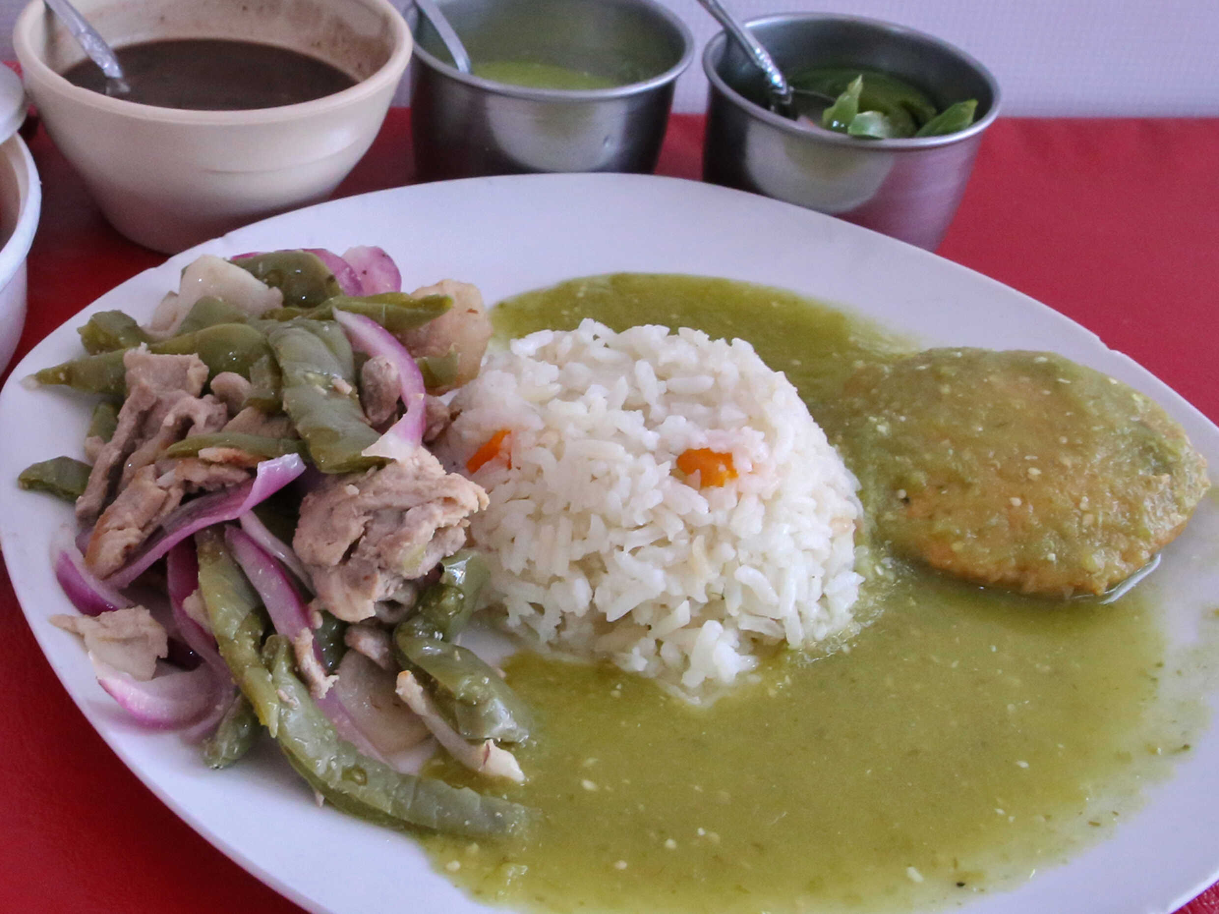 Carne de puerco, con pimiento morrón, cebolla picada y un poco de chile jalapeño, con tortillas, arroz, frijoles refritos, salsa verde o roja