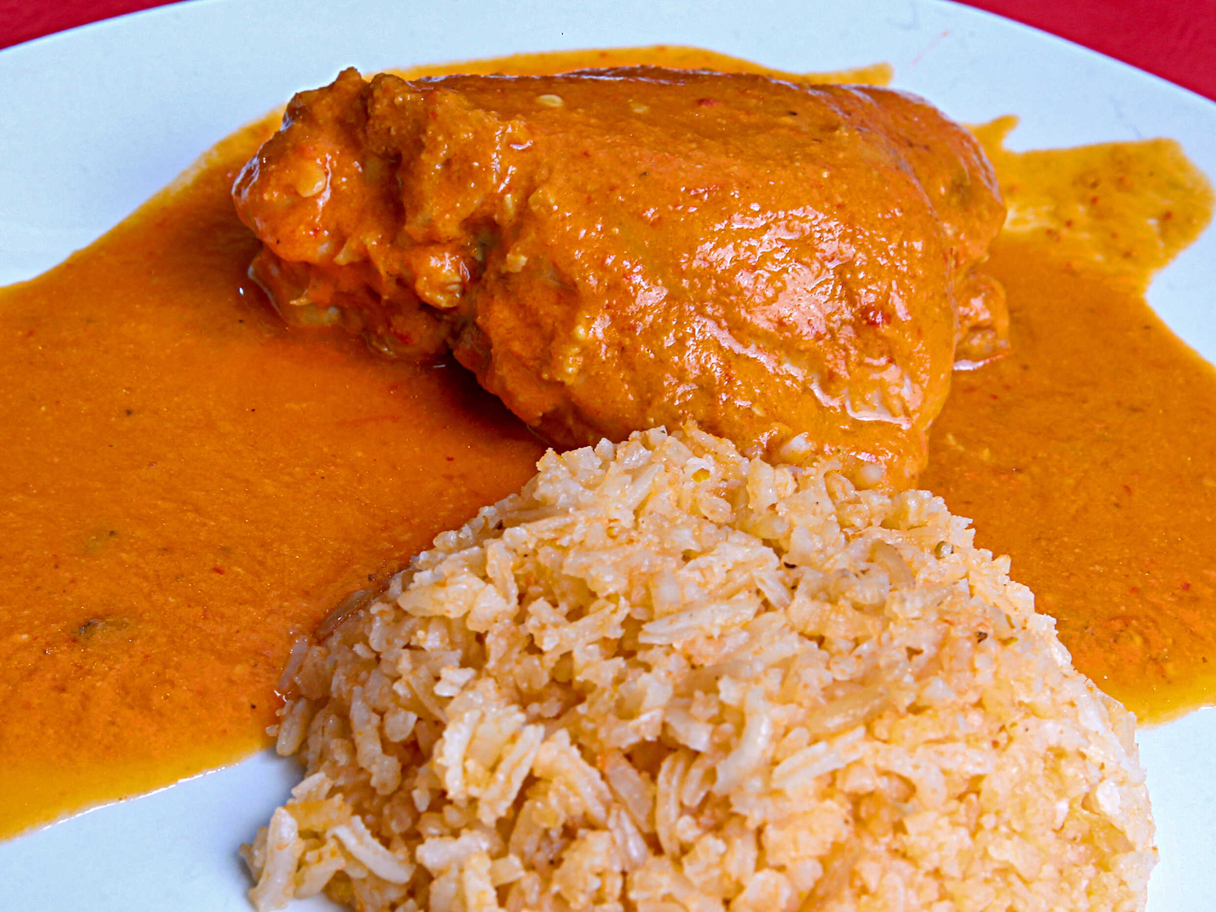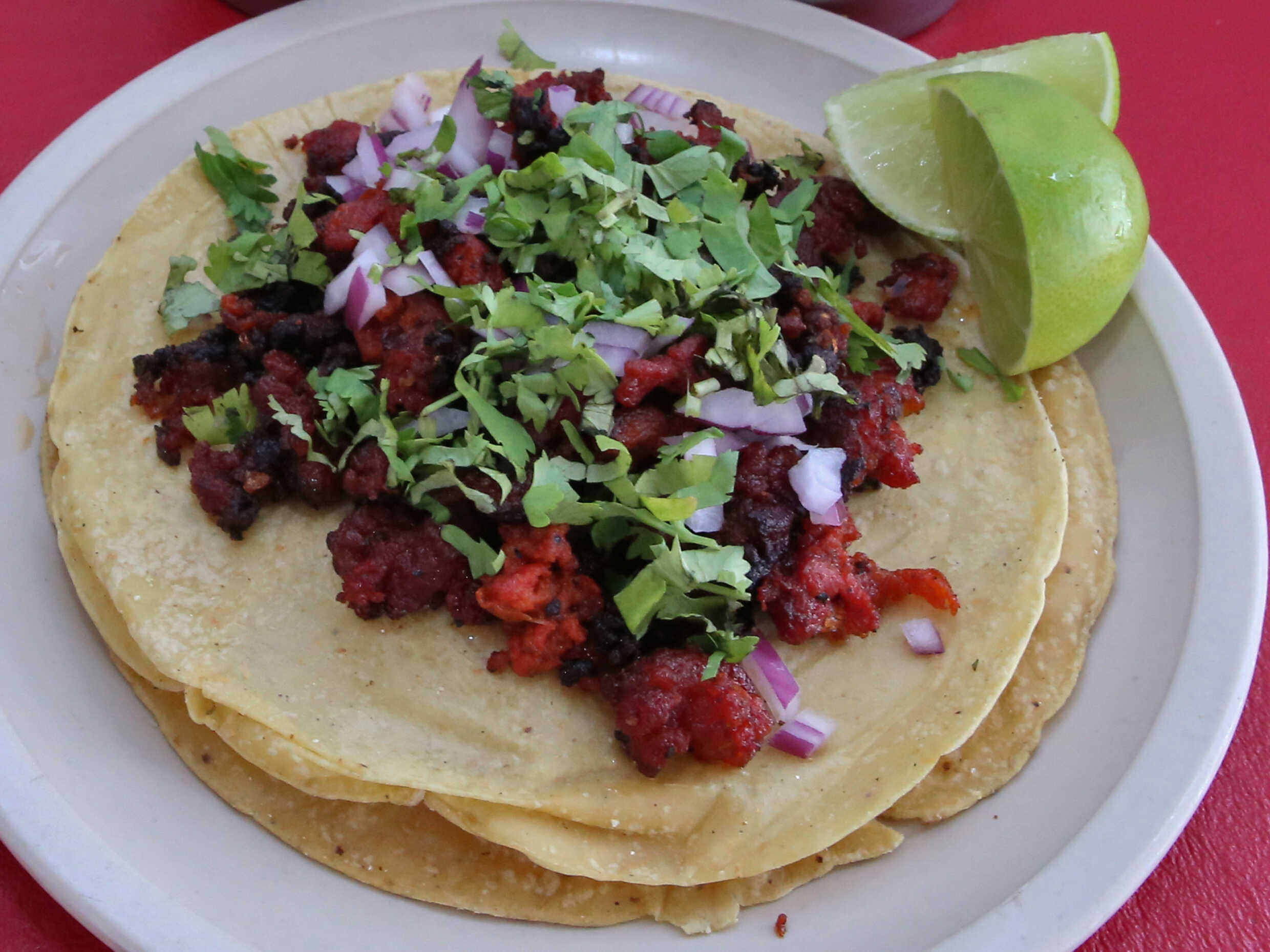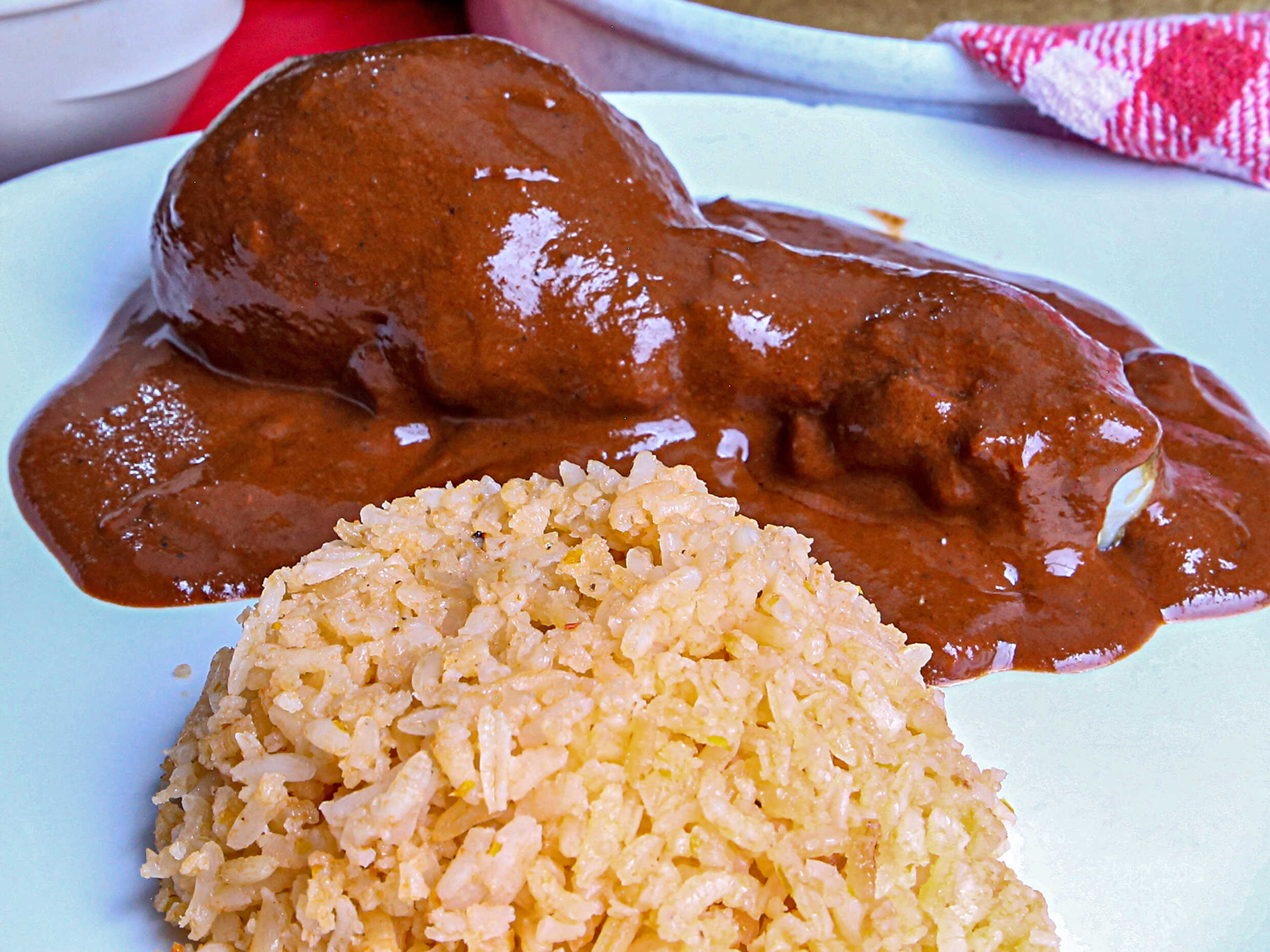 Carne de puerco, con pimiento morrón, cebolla picada y un poco de chile jalapeño, con tortillas, arroz, frijoles refritos, salsa verde o roja